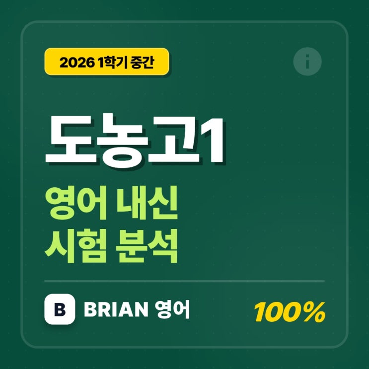 전체적인 문항 분석은 따로 아래 작성했습니다. 전반부는 카드이미지 형식을 통해 학부모님들도 시험의 특징을 한눈에 살보도록 구성했습니다 후반부는 학생들이 문항별 특징을 복기하도록 문항별 구성을 첨부했으니 참조해서 다음 시험에 활용하세요!! [도농고 1학년 1학기 중간고사 영어 내신 분석] 전체 개괄 (General Overview) 출제 범위 및 비중: 교과서와 외부 지문(모의고사 또는 부교재)이 적절히 혼합되어 출제되었습니다. 특히 '본문 2'과 관련된 지문이 여러 문항(1, 2, 5, 17, 18, 23, 24번 등)에 걸쳐 비중 있게 다뤄진 것이 특징입니다. 난이도 구성: 전반적으로 지문의 핵심 내용을 정확히 파악하고 있다면 풀 수 있는....... <img src="https://blogthumb.pstatic.net/MjAyNjA0MjVfMjYg/MDAxNzc3MDU4MjYxODQw.C9Bx_7z01n4EVjOoG2wWIBBCDc-hnDuS4JxHBjN2X0Eg.m2vJdUo4Zgk17AcD8VbL3cj3jtDCudWtJO6YXwoHyUkg.JPEG/BRIAN%BF%B5%BE%EE_%B5%B5%B3%F3%B0%ED1_%BD%C3%C7%E8%BA%D0%BC%AE.jpg?type=s3" />