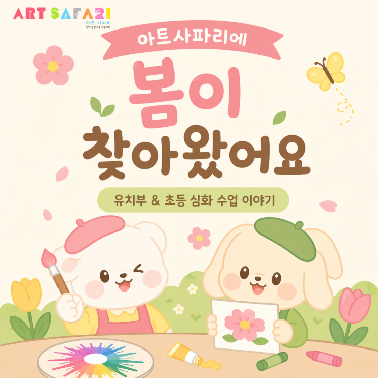 아트사파리에 봄이 찾아왔어요 따스한 햇살과 함께 아트사파리에도 포근한 봄이 찾아왔습니다 요즘 아이들은 각자의 시선으로 봄을 바라보며, 자신만의 색과 형태로 봄을 표현하는 시간을 보내고 있어요~ 같은 꽃을 보고도, 같은 계절을 느끼면서도 모두 다른 그림으로 표현해내는 우리 아이들 정말 사랑스럽고 귀여울 것 같지 않나요? 아이들의 작품 속에 피어난 사랑스러운 봄 이야기 들려드리겠습니다 ! 유치부 수업 이야기 3월 유치부 수업에서는 데미안 허스트의 스핀아트 기법을 활용해 움직임에 따라 색이 퍼지고 섞이는 과정을 경험해 보았습니다 빙글빙글 돌아가는 물감 속에서 만들어지는 색의 흐름을 보....... <img src="https://blogthumb.pstatic.net/MjAyNjA0MjNfMTQ2/MDAxNzc2OTE5OTA5MzA5.Kz9kOgv6tGvWPIEiXIBDTamexF_WpV9MtxoLIeGKSvcg.WbttBZdt5L6BDdKI3kOzZ8aRwV5G1Ir1FxICbAmCoDAg.PNG/%C1%A6%B8%F1%C0%BB_%C0%D4%B7%C2%C7%D8%C1%D6%BC%BC%BF%E4..png?type=s3" />
