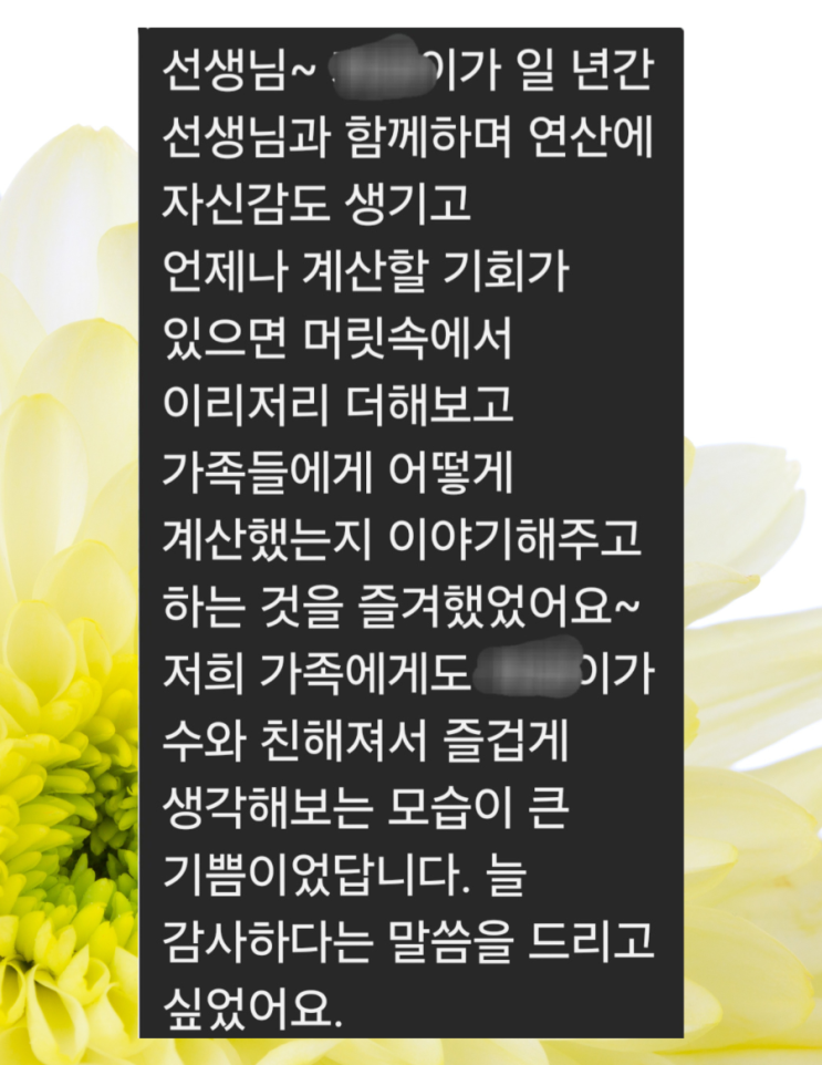 초등 저학년 수학에서 많은 부모님들이 가장 고민하시는 부분이 바로 ‘연산’입니다. 속도를 높여야 할지, 틀리지 않게 해야 할지, 반복을 더 시켜야 할지… 하지만 수학이 좋아지는 순간은 생각보다 다른 지점에서 시작됩니다. 이전을 앞두고, 아쉽게 작별하게 된 초1 친구와의 마지막 수업. 수업을 마치고 받은 어머님의 장문의 메시지를 읽다 한참을 멈춰 서 있었습니다. ⠀ “계산할 기회가 생기면 머릿속에서 이리저리 더해보고, 그걸 가족에게 이야기해 주는 걸 즐거워해요.” ⠀ 이 한 문장이 유독 오래 마음에 남습니다. 연산을 ‘시키면 하는 것’이 아니라 스스로 해보고 싶어지는 상태. 이 경험이 쌓일 때 비로소 수학이 ‘해야 하는....... <img src="https://blogthumb.pstatic.net/MjAyNjA0MjhfMTQ4/MDAxNzc3Mzc3MDgyMjQ2.nx596teckXKBS-CSws3lK7psQTHydh-MS1tHv6y9Y00g._qf7JcCsIgZLKp6huxoRN_bW0bmg7Xle53pSgGUp43Eg.PNG/900_Yellow_Minimal_Blank_US_Letter_Document__20260428_201552_0000.png?type=s3" />