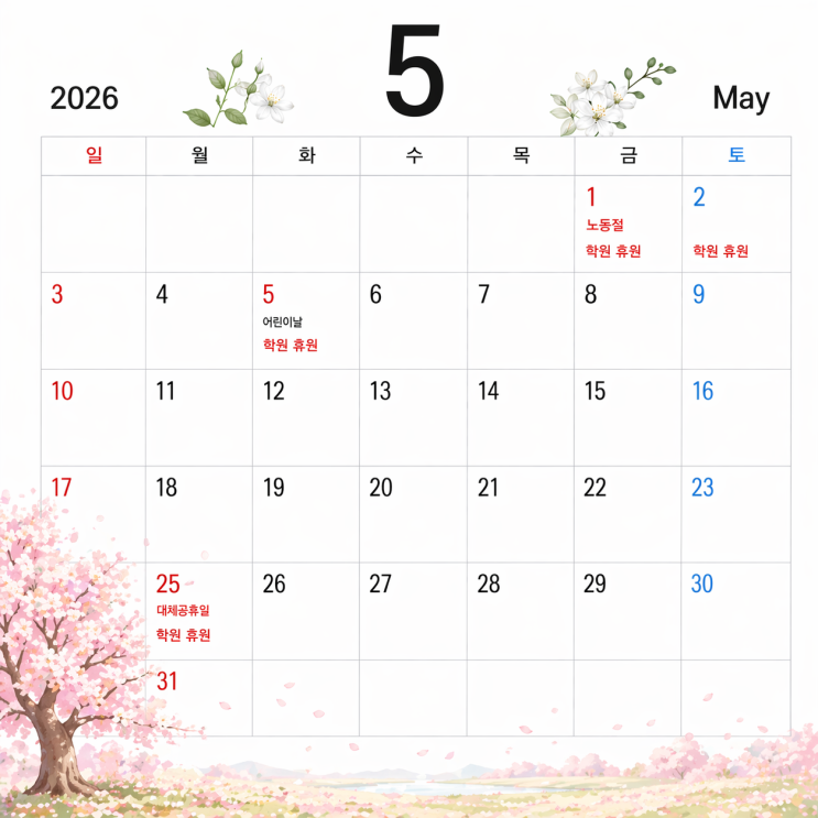 [ 수학마녀 & 영어마녀 26년 5월 휴원일정 안내 ] 안녕하세요~ 수학마녀&영어마녀학원입니다. 5월 학원 휴원일정 안내 드립니다. 5/1 (금) 노동절 -공휴일- 5/2 (토) 토요보강 휴강 -중간고사 종료 후 학원자체휴원- 5/5 (화) 어린이날 -공휴일- 5/25(월) 대체공휴일 -공휴일- 5/4(월) 정상수업합니다. 셔틀 정상운행 5월 학원 휴원일정 참고하시어, 아이들 스케줄 확인부탁드립니다~ 감사합니다~^^ <img src="https://blogthumb.pstatic.net/MjAyNjA0MjNfMjAz/MDAxNzc2OTI0MDA1NTM3.DJLmB1AWFjT-elc6nMkEJ2P_lZSqWGYNP-YiUMo1O1Ig.U2MT1-s4AfPC4lrSQQ_IfSTFK8ct4GFoPiUeizkNOZYg.PNG/5%BF%F9%B4%DE%B7%C2.png?type=s3" />
