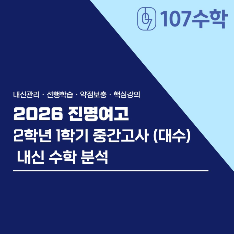 안녕하세요, 목동 107수학학원입니다. 2026학년도 진명여고 고2-1 중간고사 수학 시험이 마무리되었습니다. 시험지를 분석해보면 이번 시험은 단순한 계산 능력을 평가하는 시험이 아니라, 개념 이해와 문제 해석 능력을 동시에 요구하는 시험이었다는 점이 가장 큰 특징입니다. 특히 지수·로그와 삼각함수, 함수 그래프가 결합된 문항들이 다수 출제되면서 평소 문제를 많이 풀어본 학생과, 개념을 정확히 이해하고 적용할 수 있는 학생의 차이가 뚜렷하게 드러난 시험이었습니다. ✔ 전체 난이도 ✔ 출제 경향 ✔ 핵심 문항 분석 ✔ 기말고사 대비 전략 까지 실제 시험 데이터를 바탕으로 자세히 분석해보겠습니다. 1. 시험 총평 이번 진....... <img src="https://blogthumb.pstatic.net/MjAyNjA0MjhfOSAg/MDAxNzc3MzY2NzkyMjM3.vqZY2GT5qtn60rllYdFBiYo52t9CaOWlxj58Am-8_9gg.uRTyNwGjRHsPCZYVicM9rW8QvNxPNkSjwFQ5qOqLBL0g.PNG/image.png?type=s3" />