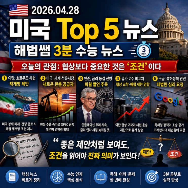 2026.04.28 미국 Top 5 뉴스 해법쌤 3분 수능 뉴스 오늘의 관점: 협상보다 중요한 것은 ‘조건’이다