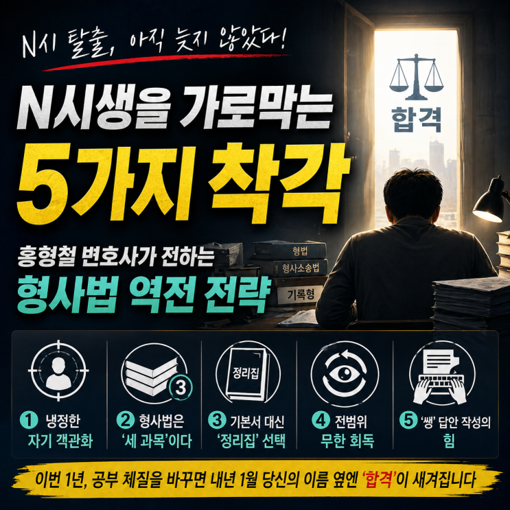 당신의 'N시' 탈출을 가로막는 5가지 착각 : 홍형철 변호사가 전하는 형사법 역전 전략 1. 서론 발표 직후, 지금 당신에게 가장 필요한 것은 '냉정한 자기 객관화' 변호사 시험 결과 발표 직후, 불합격의 고배를 마신 수험생들의 심정은 이루 말할 수 없을 것입니다. 하지만 냉정하게 말씀드립니다. 슬퍼하고 있을 시간이 없습니다. 내년 1월 시험까지 우리에게 남은 시간은 결코 넉넉하지 않습니다. 1년이라는 시간은 순식간에 지나가며, 지금 바로 정신을 차리지 않으면 내년에도 똑같은 결과를 마주하게 될 것입니다. "열심히 공부했는데 왜 점수가 나오지 않았을까?" 단순히 운이 없었다는 핑계는 버리십시오....... <img src="https://blogthumb.pstatic.net/MjAyNjA0MjlfMTk3/MDAxNzc3NDQ3Njg0MzI0.GapiMYEyhllagYqo9zxijuZGPzZJ6iz4O4V3dbvWuq8g.bsomAcWOVaEIr2GbIOuEbOaGOFrHODVurmsC9Ioy7Qgg.PNG/%C8%AB%C7%FC%C3%B6_%BD%E6%B3%D7%C0%CF.png?type=s3" />
