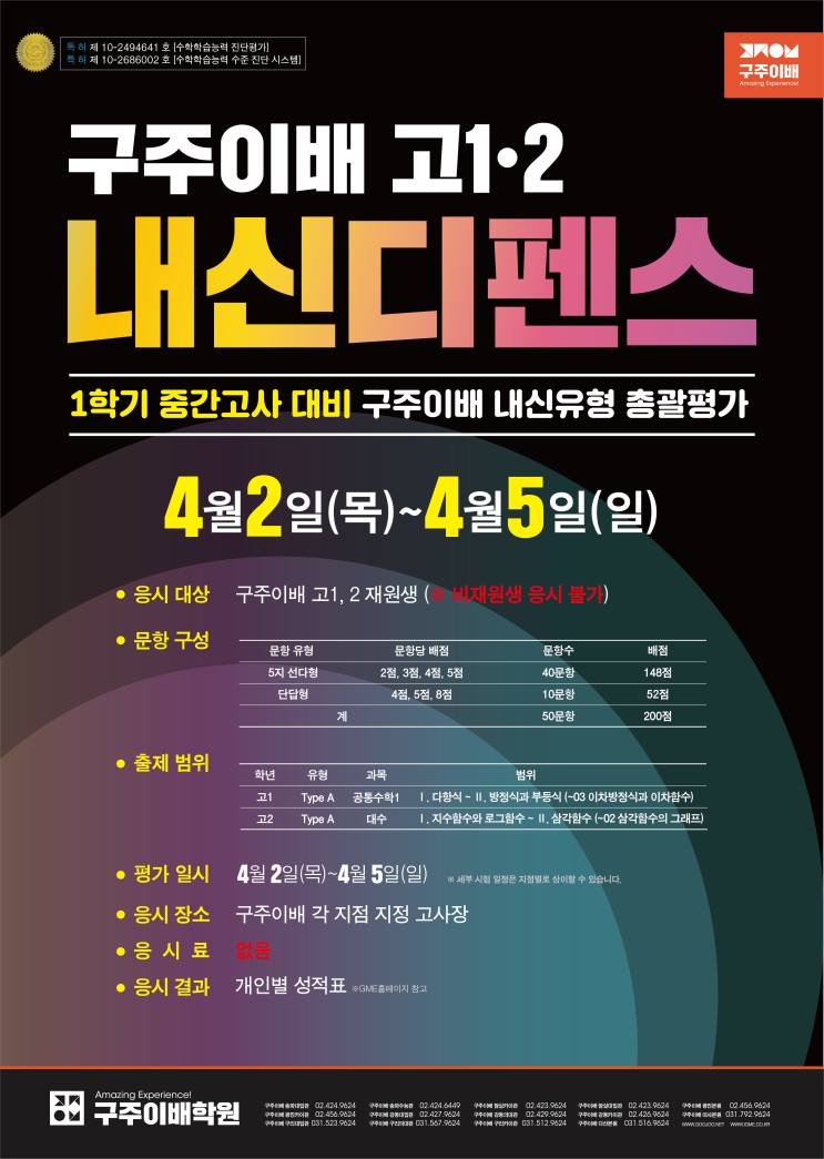 안녕하세요. 구주이배 잠실본원입니다. 4월 5일(일) 중1·2·3, 고1·2 재원생을 대상으로 구주이배 내신 유형 총괄 평가 1학기 중간고사 내신디펜스 가 시행되었습니다. 내신디펜스 현장 스케치 한 해의 첫 시험을 앞두고 재원생들 모두 열정적으로 집중하는 모습이 인상깊었습니다. 시험 결과는 GME 사이트에 게시될 예정입니다. 성적과 관련하여 궁금하신 사항은 담임선생님께 문의하여 주시기 바랍니다. 4월 19일(일) 진행 예정인 2차 중등 내신디펜스도 해당 재원생 모두 빠짐없이 응시해주시기 바랍니다. 구주이배 내신디펜스 한 학기를 시작하는 1학기 중간고사! 재원생 모두의 만점을 기원하며 구주이....... <img src="https://blogthumb.pstatic.net/MjAyNjA0MDdfMTky/MDAxNzc1NTYxMzY0MTgw.w5Wx9kbG9lG8gKvaLyfIWs_imxPVrmXekF4tq8or298g.FDoEDRKwIwv6i8Gm3mB_rJC2XCfg1VdRJI6d9Ui8LE8g.PNG/2026_1%C7%D0%B1%E2%C1%DF%B0%A3_%B3%BB%BD%C5%B5%F0%C6%E6%BD%BA.png?type=s3" />