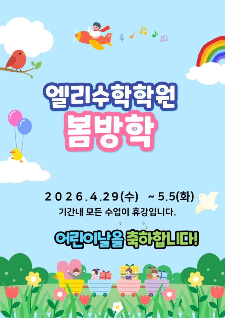 어느덧 만개한 꽃들과 함께 아이들의 마음도 설레는 5월이 다가오고 있습니다. 5월 초 근로자의 날과 어린이날을 포함한 징검다리 연휴, 그리고 각 학교의 재량휴업일 일정에 맞춰 우리 아이들이 가족과 함께 소중한 시간을 보낼 수 있도록 엘리수학 봄방학을 실시합니다. 특히 이번 방학은 큰 시험을 앞두고 에너지를 충전하는 매우 중요한 시기입니다. 아래 일정을 꼭 확인해 주시기 바랍니다. 엘리수학 봄방학 및 휴강 일정 방학 기간: 2026년 4월 29일(수) ~ 5월 5일(화) 휴강 안내: 정규 수업 및 토요 단원평가 휴강 수업 재개: 5월 6일(수)부터 정상 수업 ️ 5월 학기 시작 및 대체공휴일 안내 5월 수업 시작일: 4월 27일(월)부터....... <img src="https://blogthumb.pstatic.net/MjAyNjA0MThfMjMz/MDAxNzc2NDgyNjAyNjkw.wObMt4l9bZbJ-1Hcdt5YvPJt5MASn81I5W90PtY8Wi0g.yuYKMaRkwkdrCESEXYqSm5uBYVP6bzVIV1tMxBGBGnog.JPEG/%C1%A6%B8%F1%C0%BB_%C0%D4%B7%C2%C7%D8%C1%D6%BC%BC%BF%E4._%2817%29.jpg?type=s3" />