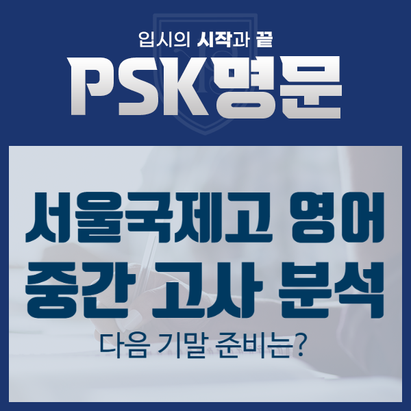 안녕하세요 PSK명문입니다. 오늘 서울국제고 1학년 영어 중간고사가 끝났습니다. 고등학교에 올라가서 첫 시험에서 첫째 날 시험이 영어였습니다. 많은 학생들이 어렵게 느꼈으며, 문제지가 13장이었고, 문제를 다 풀지 못한 학생들이 많았다고 합니다. 첫 시험이 끼치는 영향이 크지만 남은 시험을 잘 보기 위해 마음을 잘 잡고 시험을 잘 마무리하는 것이 필요하며, 기말과 점수가 합산되므로 중간고사를 잘 분석하고 준비 방향을 설정하는 것이 중요합니다. 시험지를 직접 분석해 보면, 이번 시험은 단순히 영어를 해석하는 학생과 영어를 구조적으로 이해하고 답안으로 완성할 수 있는 학생을 분명하게 가르는 시험이었습니다. 겉으로 보기에....... <img src="https://blogthumb.pstatic.net/MjAyNjA0MjBfNzMg/MDAxNzc2Njc5OTUyODE3.vZDS2_d7sdvrmtcaSn5mi5DqDNG5HggTZCDZlQLlMeUg.tU0CcYOcuVz6uQPWgZ3tk6ffImwC7fiJs8QJn_v_V9Ig.PNG/PSK%B8%ED%B9%AE_%BD%E6%B3%D7%C0%CF.png?type=s3" />