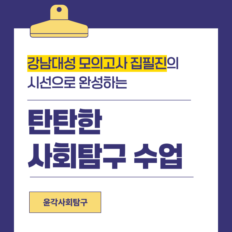 강남대성 모의고사 집필진의 시선으로 완성하는 탄탄한 사회탐구 수업 "사회탐구 입시 최전선에서 출제 트렌드를 가장 먼저 읽어냅니다" 안녕하세요! 사회탐구 1등급을 현실로! 광주 봉선동 윤각사회 탐구입니다. 많은 학생들이 사회탐구 학원을 선택할 때 고민하는 것, 바로 "입시 트렌드를 잘 파악하는 곳인지", "입시 출제 경향을 잘 분석하는 곳인지" 입니다. 저희 윤각사회탐구는 위 고민들에 대해 뛰어난 '출제 트렌드 감각'을 가지고 있는 곳이라고 자신있게 말씀드릴 수 있습니다. 바로 고예윤 원장님은 출제 경향 분석을 넘어 실제 문제를 만드는 집필진으로 활동하고 계시기 때문인데요. ....... <img src="https://blogthumb.pstatic.net/MjAyNjA0MTNfMjM2/MDAxNzc2MDQyNzkxODAy.xHXYStepjs5ShFXYmb2jmAq3XpYvOnmN5b4zSveECl8g.1yW83hWH-e8OsBwNFZw17ZzxAoTmLN1xYXesTUlslyIg.PNG/%C0%B1%B0%A2%BB%E7%C8%B8%C5%BD%B1%B8-035.png?type=s3" />