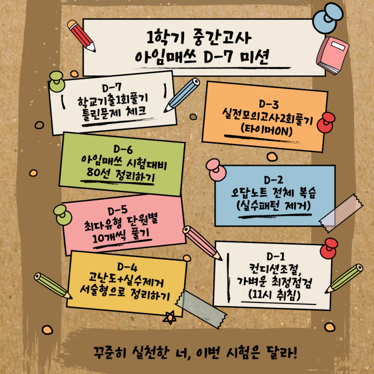 안녕하세요. 아임매쓰수학입니다. 중간고사가 일주일 앞으로 다가왔습니다. 이 시점에서 가장 중요한 것은 '새로운 공부가 아니라 <정리와 완성> 입니다. 많은 학생들이 마지막 1주일을 무작정 문제 많이 풀거나, 부족한 개념 계속 찾기로 보내다가 오히려 실수가 늘어납니다. 아임매쓰수학에서는 7일 완성 플래너 + 미션 시스템으로 우리 학생들의 점수를 실질적으로 끌어올립니다. ▧ 1학기 중간고사 D-7 학습 전략 ▷ 개념 → 이미 끝났어야 합니다 - 지금은 정확도 + 실수 감소 + 유형 정리 단계 ▶ 하루 공부는 ‘목표형’으로 운영해야 합니다 ▧ 7일 완성 플래너 ● D-7 ~ D-5 (기출 + 핵심 유형 완성) 1. 학교별 기출문제 분....... <img src="https://blogthumb.pstatic.net/MjAyNjA0MjBfMjM0/MDAxNzc2NjExMjA0NjA2.BKYl3aVO7HcfoNx6cbQZA2ikQGCZPt9igMUjpaQFNzsg.-_s1UhkMfnthRqeGYm8rZxCXfsbmS23dFrDsih3eGGwg.PNG/%B9%CC%BC%C7%C4%AB%B5%E5.png?type=s3" />