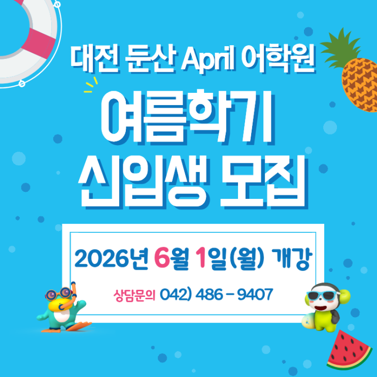 대전 둔산 에이프릴 어학원에서 2026년 여름학기 신입생을 모집합니다. 지금 등록하면 다양한 혜택까지 받을 수 있는 절호의 찬스이니 놓치지 마세요! 여름학기 개강 안내 개강일: 2026년 6월 1일(월) 등록자 전원 혜택 (100% 증정!) 입학시험 응시 당일 등록자 전원에게 다음과 같은 기프티콘 랜덤 1종을 100% 증정합니다. - 배스킨라빈스 쿼터 아이스크림 - 크리스피 도넛 오리지널 글레이즈드 더즌 - 교촌치킨 반반한마리 (간장+레드) ✅이벤트 기간 2026년 4월 20일(월) ~ 6월 30일(화) ✅ 참여 방법 온라인으로 입학시험 예약 및 학원 방문하여 시험 응시 당일 등록 완료 시 혜택 자동 지급! ✅ 유의사항 - 본 이벤트는 2026년 여름학....... <img src="https://blogthumb.pstatic.net/MjAyNjA0MjFfMjU1/MDAxNzc2NzQ2MTE0MTQ4.1IAQkSZjfIRuMKiQTM3QPI6TjnxALFotU0RuDZ6x08Ug.dUQssZyDsPYH9br3zAeIiGRGb89DVxHAjEvAYVBwXV0g.PNG/%C1%A6%B8%F1%C0%BB_%C0%D4%B7%C2%C7%D8%C1%D6%BC%BC%BF%E4._%281%29.png?type=s3" />