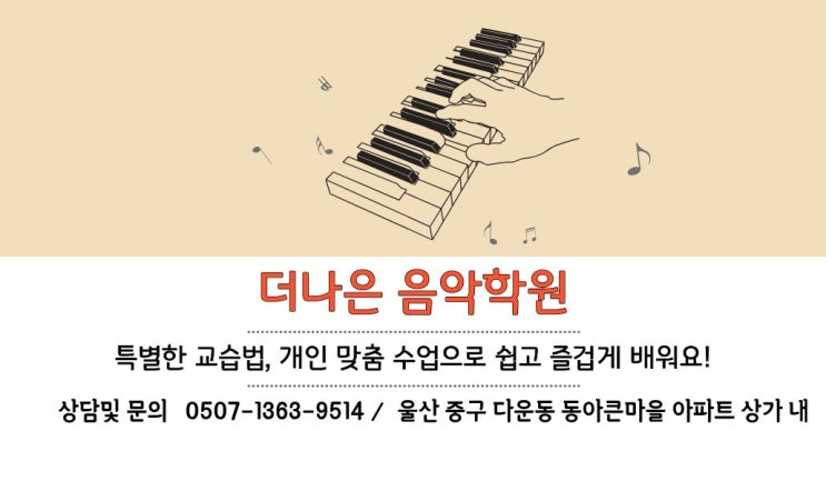 안녕하세요. 울산 중구 다운동에서 아이들의 웃음소리와 아름다운 선율로 매일 행복을 빚어내는 더나은 음악학원입니다. https://open.kakao.com/me/thenaeunmusic ( 오픈 카카오톡 - 상담 신청) ☎ 0507-1363-9514 (바로 연결) 새 학년, 새 학기에 적응을 할 4월! 이 시기가 되면 많은 부모님들께서 자녀들의 정서 발달과 집중력 향상을 위해 피아노 학원을 알아보실 텐데요. 상담을 오시는 학부모님들의 걱정하시듯 이야기하시곤 합니다. 저도 어릴 때 체르니 30까지 쳤는데 매번 똑같은 연습에 선생님께 혼나며 배웠던 기억이 나요. 우리 아이는 저처럼 힘들게 피아노를 배우지 않았으면 좋겠어요. 더나은 음악학원에서는 그런 걱정이 필요 없....... <img src="https://blogthumb.pstatic.net/MjAyNjA0MjFfMjgw/MDAxNzc2NzUzNTg1MDU5.0MaLL5vJtWLeJv5y_YR3EwHdTKZsKPod_6kQYK2hhisg.isdrAcAZu9C8VqEn0dsG1A8cdbieesAA6aCT3B3P3QEg.JPEG/%C1%A6%B8%F1%C0%BB_%C0%D4%B7%C2%C7%D8%C1%D6%BC%BC%BF%E4._%2850%29.jpg?type=s3" />