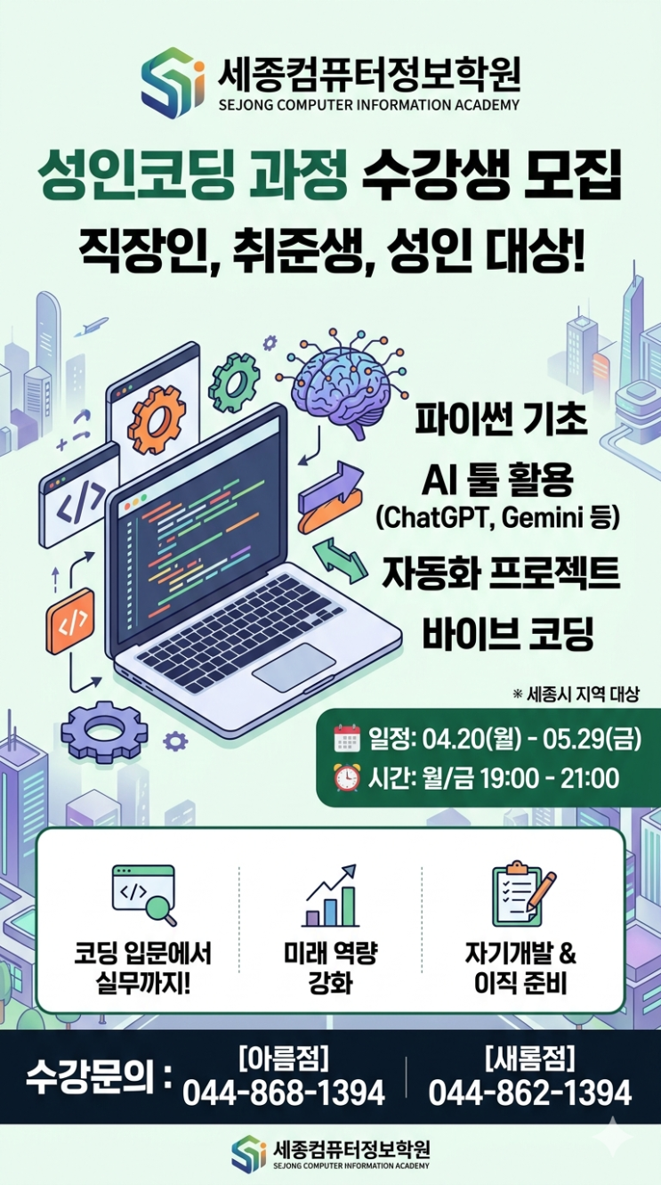 안녕하세요~ 세종시 IT전문 교육기관 세종컴퓨터정보학원입니다^^ 급변하는 AI시대, 단순한 사용자를 넘어 AI를 직접 다루고 업무를 자동화하는 '메이커'로 거듭나고 싶은 성인분들을 위해 세종컴퓨터정보학원이 특별한 커리큘럼을 준비했습니다. 취업 준비의 경쟁력을 높이고 싶은 취준생부터, 업무 효율을 10배 이상 끌어 올리고 싶은 직장인까지! 전문 강사가 전수하는 실전 압축 코딩 & AI 활용 노하우를 만나보세요~ 단순히 이론만 배우는 강의가 아닙니다. 파이썬 코딩으로 기본기를 다지고, AI툴 및 자동화 실습으로 곧바로 결과물을 만들어내는 입체적인 학습을 진행합니다. 코딩의 시작인 파이썬을 가장 효율적으로 배웁....... <img src="https://blogthumb.pstatic.net/MjAyNjA0MTdfNDUg/MDAxNzc2Mzg5NzI5MTc3.uFbCQACPzLOVLjdUVn1a8syZcTe9P0F3gxpPFungo1Ig.3NVxUiUkRBxOM4mQUE6GCazG6NDUofanxbpGy-9Pdtgg.PNG/%BC%BA%C0%CE%C4%DA%B5%F9_%285%29.png?type=s3" />