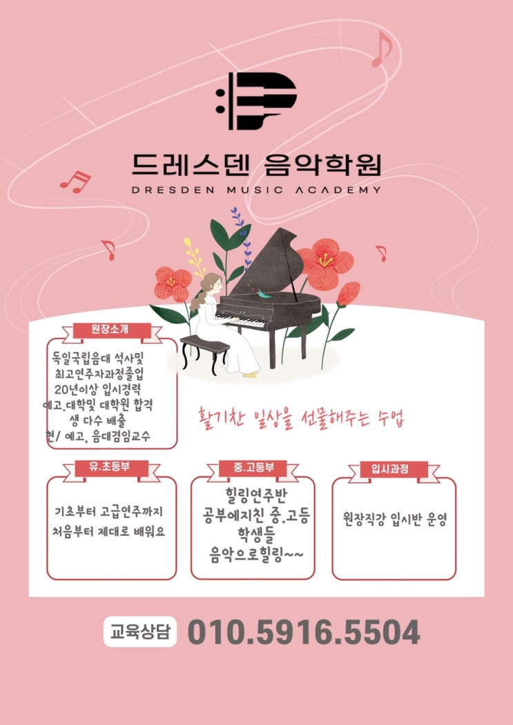 안녕하세요~^^ ”피아노연주실력“ 하면 드레스덴이란걸 이제 많은 힉부모님들 사이 입소문만으로 아시는분들은 이미 알고 계시지요<^^ 음악이 아이들에게 주는 커다란 영향력들을 스마트한 학부모님들은 이미 아시는만큼 우리아이들의 첫 피아노교육을 맡길곳은 신중하게 선택할수 밖에 없습니다~ 원장님은 현재 / 음악 대학 피아노학부 겸임교수로 재직중 이시며 연주자 이십니다~~ 예중, 예고, 대학, 대학원, 유학준비 까지 입시까지 지도하시는 배테랑 이십니다!! 다양한 음악경험과 고등학교 음악교사 출신 부원장님, 연주력은 물론 아이들을 사랑하는 따스한 인성까지 갖춘 전문강사선생님들로 이루워진 드레스덴 음악....... <img src="https://blogthumb.pstatic.net/MjAyNjAzMjhfOTkg/MDAxNzc0Njc3MDM1OTAx.3yKn-yBZ9SL6leBdYwNAY9cTDZBRMXhmhzmb8uN7rOAg.XzrKHEEYM3bFtXvY1p9b3XFE_xhvBq5rlLBelwNLWoUg.JPEG/IMG%A3%DF8208.JPG?type=s3" />
