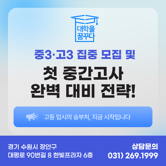 빠르게 변화하는 입시제도, 1-2점 차이로 좌우되는 대학입시! "대학을 꿈꾸다 학원"에서 상담 받고 꿈꾸는 대학에 진학하세요! 따스한 봄기운이 가득한 4월, 새로운 학년의 첫 단추를 끼우는 매우 중요한 시기를 지나고 있습니다. 우리 학생들이 각자의 목표를 향해 힘차게 나아갈 수 있도록 대학을 꿈꾸다 학원은 오늘도 최선을 다해 지도하고 있습니다. 오늘은 특히 입시의 변곡점에 서 있는 중3, 고3 학생들을 위한 소식과 함께 곧 다가올 중간고사 대비 전략을 전해드립니다. 고등 입시의 결정판, 중3 시기를 절대 놓치지 마세요! 중학교 3학년은 단순히 중학교의 마지막 학년이 아닙니다. 사실상 고등학교 입시 전략이 시작되는 &....... <img src="https://blogthumb.pstatic.net/MjAyNjA0MTBfMjQ0/MDAxNzc1ODE2NjA5NDc2.zHI-zDc_jGdPfItcQwta_uLCDhWnA-2NKt3a7jejBzcg.O51RtmGpgiVbMeo73fBdBjvx5arGKIh8Ugof7lRtlhYg.PNG/1.png?type=s3" />