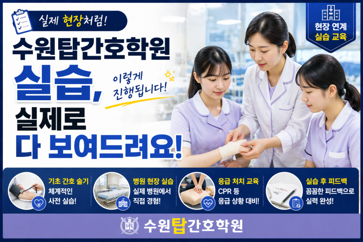 안녕하세요. 병원에서 오랜 기간 근무했고, 현재 간호학원에서 학생들을 가르치고 있는 강사입니다. 상담을 하다 보면 학부모님들이 가장 많이 물어보시는 질문이 있습니다. “실습은 실제로 어떻게 진행되나요?” 이 질문을 하시는 이유는 분명합니다. 단순히 배우는 것이 아니라 아이를 병원 현장에 보내도 되는지 확인하고 싶으신 겁니다. 그래서 오늘은 수원탑간호학원의 실습이 실제로 어떻게 진행되는지, 있는 그대로 설명드리겠습니다. 실습은 ‘갑자기 병원에 나가는 것’이 아닙니다 많은 분들이 오해하시는 부분입니다. 실습은 단순히 “시간이 되면 병원에 보내는 것”이 아닙니다. 그 전에 반드시 거치는 과정이 있습니다. 기초 간호....... <img src="https://blogthumb.pstatic.net/MjAyNjA0MjdfMTc5/MDAxNzc3MjY3NzQwNTI3.jN22X4rQsjiTMGEP6YdUdasNmVlnra5T0ZX9pB2AbKsg.ZRvmw_uyiMAuW0H9zMRj0K6I0KqwmCANi9bu82-Gsxkg.PNG/ChatGPT_Image_2026%B3%E2_4%BF%F9_27%C0%CF_%BF%C0%C8%C4_02_28_50.png?type=s3" />