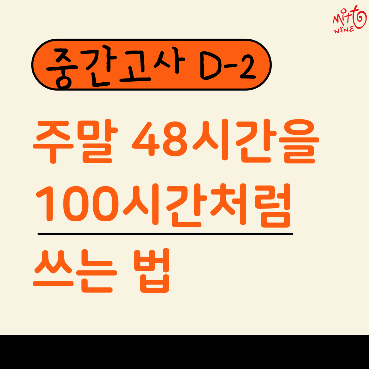 안녕하세요! 미토나인학원입니다. 이제 중간고사가 정말 코앞으로 다가왔습니다. 이번 주말만 지나면 본격적인 시험이 시작되는데요. 많은 학생이 "시간이 너무 부족해!", "아직 못 본 과목이 있는데 어떡하지?"라며 불안해하곤 합니다. 하지만 남은 48시간을 어떻게 설계하느냐에 따라 등급의 앞자리가 바뀔 수 있다는 사실, 알고 계시나요? 오늘은 미토나인학원이 제안하는 '주말 48시간을 100시간처럼 쓰는 효율 극대화 전략'을 공개합니다! 1. '새로운 문제'보다는 '틀린 문제'에 집착하라 지금 시점에 새로운 문제집을 푸는 것은 불안감만 키울 뿐입니다. 오답의 재구성: 그동안 풀었던....... <img src="https://blogthumb.pstatic.net/MjAyNjA0MjRfMTA4/MDAxNzc3MDIxMTA2Njc1.8APqiXj9jaa1KAfzbYPX0hG_wWvbD_T1G54zqnCuWFwg.omScKy6vtme_zEI_IgUbcDWvJI4x2DgVTEFIFVqHBYIg.PNG/1.png?type=s3" />