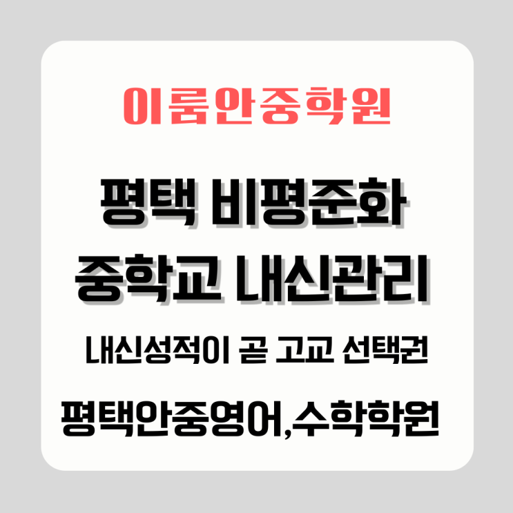 안녕하세요, 이룸안중학원입니다. 오늘은 평택 지역 학부모님이라면 꼭 알고 계셔야 할 이야기를 하려고 합니다. 바로, “평택은 비평준화 지역”이라는 사실입니다. 비평준화가 무슨 뜻이냐면, 우리 아이가 고등학교에 갈 때 추첨이 아니라 내신 성적 순으로 선발된다는 뜻입니다. 성적이 높으면 원하는 학교를 고를 수 있고, 성적이 부족하면 선택지가 줄어듭니다. 같은 경기도인데 수원, 성남, 안양, 부천, 고양 등은 평준화 지역이고 평택은 비평준화 지역입니다. 이 차이 하나가 중학교 3년의 공부 방향을 완전히 바꿉니다. 출처: 「2026학년도 경기도 고등학교 입학전형 기본계획」 (경기도교육청, 2025.3) “비평준화지역 일반고등학교는....... <img src="https://blogthumb.pstatic.net/MjAyNjA0MThfMjg1/MDAxNzc2NDM4MzA0NDk3.aozp9EnYVcj_-e_gLGAc8NErdgNAVp8k_h8rsZQnrDkg.kaOuEJYTPX9CZsroKajfZyOpgMkTPl8xxt65v94Fb6cg.PNG/%C8%F2%BB%F6%B0%FA_%B3%EB%B6%F5%BB%F6_%B1%F2%B2%FB%C7%D1_%B8%DE%B8%F0%C1%F6_SNS_%BA%ED%B7%CE%B1%D7_%C4%AB%B5%E5%B4%BA%BD%BA_%C5%B8%C0%CC%C6%B2_%BD%E6%B3%D7%C0%CF_%C0%CE%BD%BA%C5%B8%B1%D7%B7%A5_%B0%D4%BD%C3%B9%B0_%2816%29.png?type=s3" />