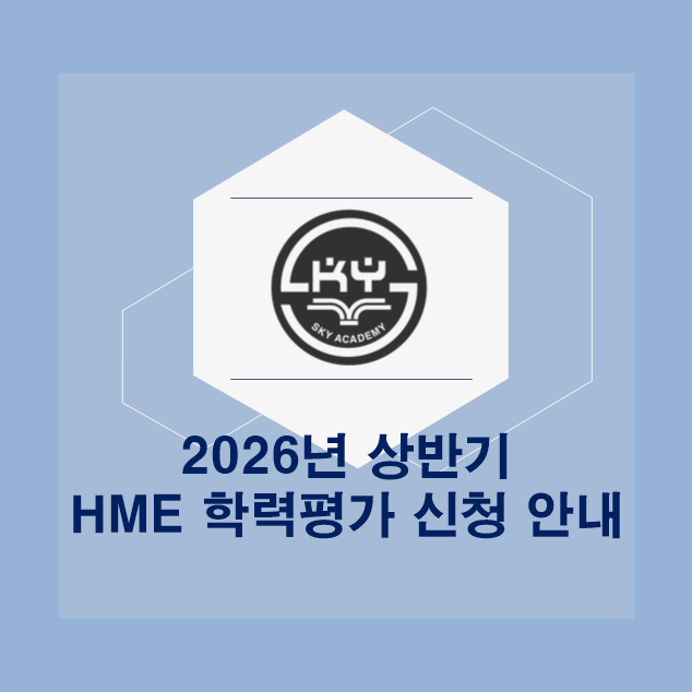 케이투스카이학원 2026년 상반기 HME 학력평가 신청 안내 안녕하세요. 케이투스카이학원 블로그를 방문해주셔서 감사합니다. 안녕하세요 케이투스카이학원입니다. 올해 상반기에도 HME 학력평가가 진행됩니다. 학생들의 학업 성취도를 점검하고, 앞으로의 학습 방향을 설정하는 좋은 기회가 될 이번 시험에 많은 관심과 참여 부탁드립니다. 시험 안내 시험일 : 2026년 6월 13일(토) 시험 시간 : 오전 11:30 ~ 12:30 (초등 1학년은 11:30 ~ 12:10) 응시 대상 : 초등 1학년 ~ 중등 3학년 시험 장소 : 케이투스카이학원 내 응시료 및 교재비 응시료 : 40,000원 교재비 : 11,000원 신청 및 대비 일정 신청 기간 : 4월 22일(수) ~ 5월 4일(월) 대비 기....... <img src="https://blogthumb.pstatic.net/MjAyNjA0MjFfNzkg/MDAxNzc2NzU2NTgxNzI4.nQyrGH92a1ijVmm4_E8TDhDqo-Zk-IYusyNhC0fBG4cg.3TPfaBnzkHKusnyBOc0fhY8nlYiTqXJ8lJmE-RLSQ-gg.PNG/image.png?type=s3" />