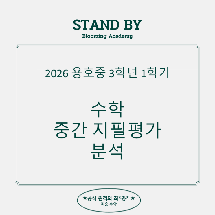 안녕하세요!! 피움수학입니다~! 2026년 용호중3학년 1학기 중간지필평가 수학 분석입니다. 이번 시험 범위는 제곱근부터 곱셈공식, 인수분해까지로 다소 넓은 편이었습니다. 다만 복잡한 인수분해는 포함되지 않아, 분량은 많지만 실제 난이도 측면에서는 기말고사와 비교했을 때 절반 수준으로 볼 수 있습니다. 가장 먼저 피움수학에서 분석한 이번 2026 용호중3학년 1학기 중간지필평가 수학 난이도는 난이도 : 중하 라고 조금 공격적으로 평가합니다. 이유는 1. 도형 연계된 제곱근 계산 문제가 1문제(12번), 비교적 쉬운 난이도로 출제 (비와 배수만 알면 풀수있는문제→초등개념) 2. 중1, 2 과정과의 혼합형 문제 없이, 순수하게 중3 과정 위....... <img src="https://blogthumb.pstatic.net/MjAyNjA0MzBfMTY3/MDAxNzc3NTE1MDk5MDI2.IKSfz5hlUKs4qm9QjgWAGVEZxKay0qhn5M_uaEOJdpsg.H26_S14NoJR__YpAsoWnhK8ZpXbV8K5Yy3UusiZkcZwg.PNG/%BA%ED%B7%CE%B1%D7_%C5%DB%C7%C3%B8%B4.png?type=s3" />