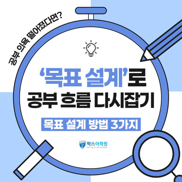 안녕하세요 탄탄한 초등부터 중·고등 내신/수능영어의 최강자! 군포 산본에 위치한 팍스어학원입니다. 시험이 가까워질수록 오히려 공부 집중이 안 되고 “뭘 해야 할지 모르겠다”는 느낌이 드는 학생들이 많습니다. 계획은 세웠지만 실행이 이어지지 않는 이유는 의지가 부족해서가 아니라 공부의 방향이 명확하지 않기 때문입니다. 이럴 때 필요한 것은 단순한 마음가짐이 아니라 ‘목표를 다시 설계하는 과정’입니다. 오늘은 공부 의욕이 떨어졌을 때 다시 학습 흐름을 살리는 목표 설계 방법에 대해 알아보겠습니다. 공부 의욕이 떨어지는 이유 많은 학생들이 “의지가 약해서 공부를 못 한다”고 생각합니다. ✔ 무엇부터 해야 할지 불명....... <img src="https://blogthumb.pstatic.net/MjAyNjA0MDhfMTIy/MDAxNzc1NjEwMTkyMTAz.l6nWIICCBmnuI1OMrnq1qhkb7bLyUyMSI9yYaVanzGsg.HxSOfLYba_tSA1d7CioJnGxB3KhO4CGgKjRsXEuj8Jkg.PNG/%BB%EA%BA%BB_%BF%B5%BE%EE%C7%D0%BF%F8_%281%29.png?type=s3" />