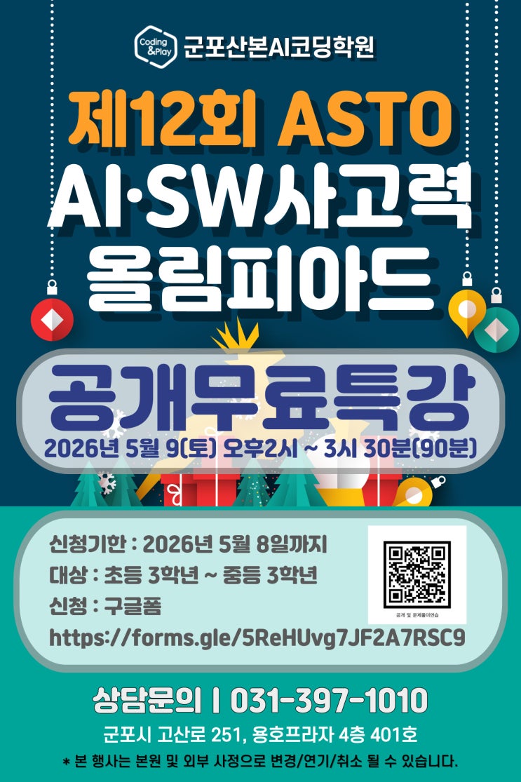 #코딩앤플레이군포산본학원, #코딩앤플레이산본센터, #군포코딩학원, #당동코딩학원, #산본코딩학원, #코딩교육, #컴퓨팅사고력, #논리적사고력, #커리큘럼, #유아코딩, #초등코딩, #신종코로나바이러스, #알버트, #산본코딩, #군포코딩, #알버트, #텔로, #ROOT, #코딩뉴스, #코딩정보, #코딩사이트, #코딩페이지, #소프트웨어정보, #소프트웨어교육, #EPL, #Scratch, #Entry, #중등코딩, #행사, #학부모, #설명회, #학부모설명회, #일상, #방역, #소독, #환기, #산본, #군포, #4차, #산업혁명, #4차산업혁명, #특강, #방학특강, #여름, #웹툰, #게임, #체험, #수, #미스터로봇 제12회 ASTO AI·SW사고력올림피아드 공개무료특강^^!! 신청자는 아....... <img src="https://blogthumb.pstatic.net/MjAyNjA0MjBfNTgg/MDAxNzc2NjU0NDU3ODQy.Q29AqrP7G2_i4DNWZrxE8zFS-wEiLB2IUny78DKWnUsg.mUUO1QsCT2GkoL5CAUFxgRcDpbmLRCcVEDvPQE4SHosg.JPEG/001.jpg?type=s3" />