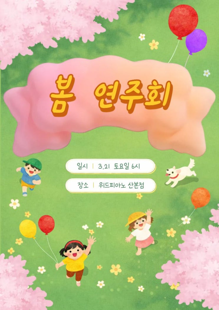 아기다리고기다리던봄연주회!!! 추운 겨울을 지나고 오랜만에 산본피아노의 연주회가 열렸답니다 간질간질 설레는 꽃놀이처럼 살랑살랑 봄을 기다리는 신나는 마음을 조금은 유치뽕짝 하지만 따듯하지만 부드러운 색들로 가득 채워 포스터로 표현해 봤어요 지금은 그 계절마다의 경계와 기간이 예전만 못하지만 사계절마다 다른 느낌을 느낄 수 있는 것도 너무 재미있는 것 같아요 그럼 봄바람처럼 따듯하면서도 설레고 간질간질했던 연주회 속으로 함께 들어가 보실까요? 라따뚜이 OST - Le festin 몽글몽글한 곡으로 연주회의 막을 올려주신 운섭님! 운동과 피아노를 병행하시는 아주 취미 부자 바지런맨이랍니다 그래서인....... <img src="https://blogthumb.pstatic.net/MjAyNjAzMjVfMjM4/MDAxNzc0NDMzMDQzNDI5.-Kfgj8EKBN2mhtTdpXImvN7lAwbMWXGG5AgON5EHBTAg.Rgo3jdd_vUY1KaJ-hcY8G-NxHo0hfnyIOH1C4AJbPOQg.JPEG/%C1%A6%B8%F1%C0%BB_%C0%D4%B7%C2%C7%D8%C1%D6%BC%BC%BF%E4._%2819%29.jpg?type=s3" />