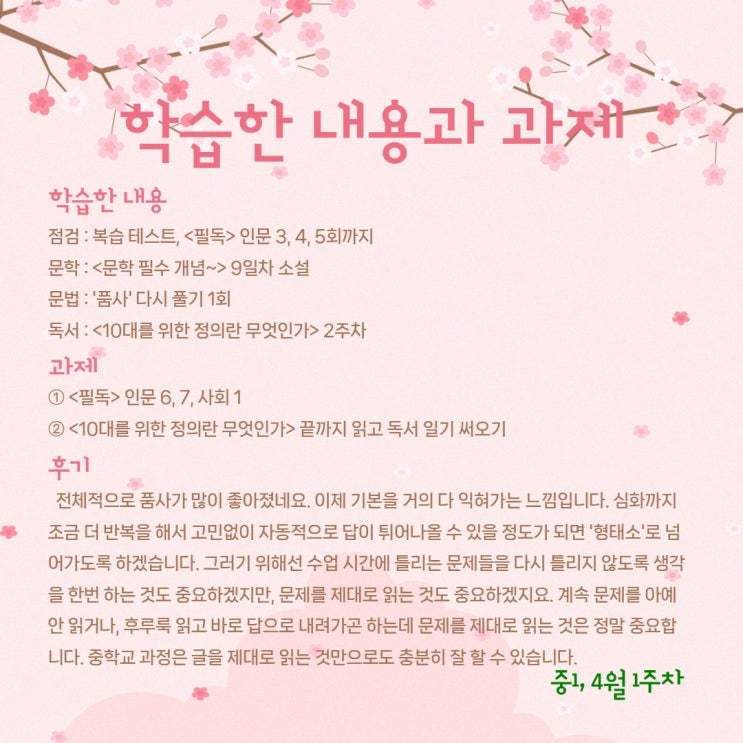 중등부 중간고사대비 주말보충이 시작되었습니다 일요일임에도 불구하고 학원에 나와서 열공하는 우리 중딩이들 수업 끝나고도 독서실에 남아서 다른 과목 공부하는 친구들도 있네요 중간고사까지 남은 시간 화이팅해서 좋은 결과 있기를 바랍니다 <img src="https://blogthumb.pstatic.net/MjAyNjA0MTJfMjEw/MDAxNzc1OTg1Njk4MjEx.Woqh8Uctg0FhOu6iML4Qn62eZaSsjQtmDUsyjf4naKUg.HeG58BNSUvNhO07BbKhT-Pb2pDH3s5e4jT6gPakUAIkg.JPEG/900_20260412_175810.jpg?type=s3" />