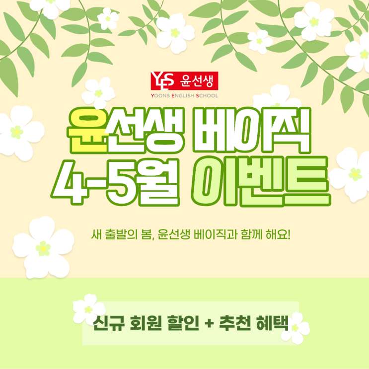 안녕하세요 윤선생 이천센터입니다! 요즘 영어 학습 고민하시는 분들 많으시죠? 특히 초등학생이나 기초 영어를 시작하려는 경우 어떤 프로그램이 좋은지 많이 고민하게 되는 것 같아요. 그래서 오늘은 윤선생 베이직에서 진행 중인 4-5월 이벤트를 정리해보려고 합니다! 신규 회원 할인부터 추천인 혜택까지 같이 진행 중이라 지금 시작하기 딱 좋은 타이밍이에요^^ 1. 신규 회원 할인 이벤트 먼저 신규 회원 대상 이벤트부터 살펴보면, 다음과 같은 혜택이 진행 중입니다~! 이벤트 기간: ~2026.05.31 첫달 학습비 할인에 레벨 테스트, 체험 수업까지! 영어 학습을 시작하려고 고민만 하고 있었다면 이런 이벤트 기간을 활용하는 것도 괜찮은 방....... <img src="https://blogthumb.pstatic.net/MjAyNjA0MTJfNDAg/MDAxNzc2MDAwOTI4OTA0.ei2zi0QXQfBT1LwQ9anOQPgsOuCGHQlJmnDalRLbnRsg.D7pVrZ_mfi34J4hDpCOz46oubQPLmr7uptQFeDYM1tEg.PNG/%C1%A6%B8%F1%C0%BB_%C0%D4%B7%C2%C7%D8%C1%D6%BC%BC%BF%E4._%281%29.png?type=s3" />