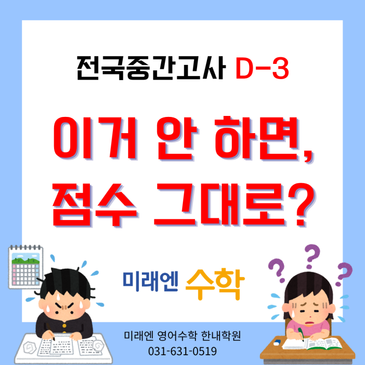 안녕하세요, 미래엔 영어수학 한내학원입니다. 미래엔수학 전국 중간고사 D-3일!! 시험이 다가오는 이 시점이 가장 불안하시죠? 저희 학원에서는 학생들의 실력을 객관적으로 점검하고 실전 감각을 키우기 위해 전국 중간고사 형태의 테스트를 진행하고 있습니다. 이번 시험은 특히 수학 한 과목에 집중된 시험이기 때문에 아이들의 실력 차이가 더 분명하게 드러나는 시험입니다. 그래서 지금 이 시점이 점수를 끌어올릴 수 있는 마지막 골든타임이라고 할 수 있습니다. 시험이 가까워질수록 아이들은 불안해집니다. 그래서 문제를 더 많이 풀려고 하거나 어려운 문제에 집착하거나 새로운 문제집을 시작하는 경우가 많습니다 하지만....... <img src="https://blogthumb.pstatic.net/MjAyNjA0MTRfMTQ3/MDAxNzc2MTUzMTY5NzUw.ik_1SjAd-vW8RbQ_GPMHf-wKm1YPS3JPEzHq5W8SvNQg.4yKL5ovB0ncrQPFowOnr9SyEpToo9dJ60Oss8gkuBNcg.PNG/2.png?type=s3" />