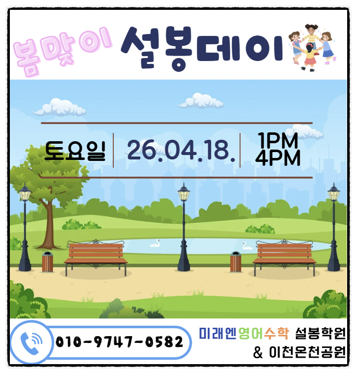 안녕하세요, 미래엔영어수학 설봉학원입니다. 어느덧 따스한 봄기운이 완연한 요즘입니다. 우리 아이들이 학업에서 잠시 벗어나 자연 속에서 마음껏 웃고 즐기며 에너지를 충전할 수 있도록 소박한 봄나들이 겸 야유회를 준비했습니다. 이번 ‘설봉데이’의 핵심은 “노는 것이 공부다!”입니다. 이날만큼은 책상 앞을 떠나 친구들과 협동하고 소통하며 즐거운 추억을 쌓는 것에 집중하려 합니다. 상세 내용을 확인하시어 신청 부탁드립니다. 행사 상세 안내 일시: 2026년 4월 18일 (토요일) 오후 1:00 ~ 오후 4:00 집결 장소: 오후 1시까지 학원 집합 활동장소: 학원 및 이천온천공원 (함께 장소로 이동합니다.) 주요 활동: 산책, 피구, 이....... <img src="https://blogthumb.pstatic.net/MjAyNjA0MTZfNTIg/MDAxNzc2MzM5NTk2MTky.5fYiYtBTrDn_7vvdW6bNBRGLq8yPyJYaQnp_qtBhT3og.AvcndQ3jmQLvmqqQO_itE1JKuwR8iTB9BYkBPNdXsm8g.PNG/image.png?type=s3" />