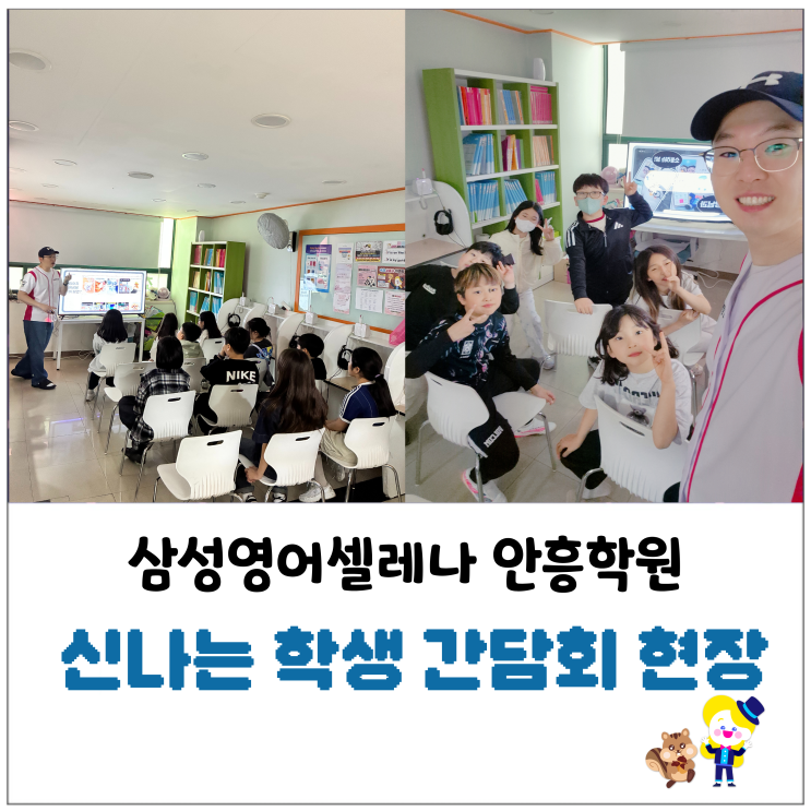 안녕하세요! 이천 안흥초 앞, 우리 아이들의 든든한 영어 파트너 삼성영어셀레나 수학여우 안흥학원의 Drew입니다. 오늘 저희 안흥학원은 평소보다 더 특별하고 활기찬 분위기였는데요, 바로 "학생 간담회"가 열렸기 때문입니다! 단순히 공부만 하는 학원이 아니라, 우리 아이들과 소통하고 함께 성장하는 학원이 되고자 준비한 이번 간담회! 퀴즈와 간식으로 가득 찼던 그 뜨겁고 즐거웠던 현장을 보여드리겠습니다! 영어 실력은 '성실'과 '태도'에서 시작된다! 영어 실력을 쑥쑥 키우기 위해서는 **성실함**과 **태도**라고 아이들 눈높이에 맞춰 쉽고 재미있게 설명하였습니다. "....... <img src="https://blogthumb.pstatic.net/MjAyNjA0MjBfMTI0/MDAxNzc2NjgwMjc1NjE5.Xa7XeHCmXq7Gsbp1YA2Cqr84XJtT-bxBPNI8WS9atn4g.RXyYQbhUoAvmu1KDRnOmZjWnxf8vclFoKtb7TW07nysg.PNG/%C7%D0%BB%FD%B0%A3%B4%E3%C8%B8.png?type=s3" />