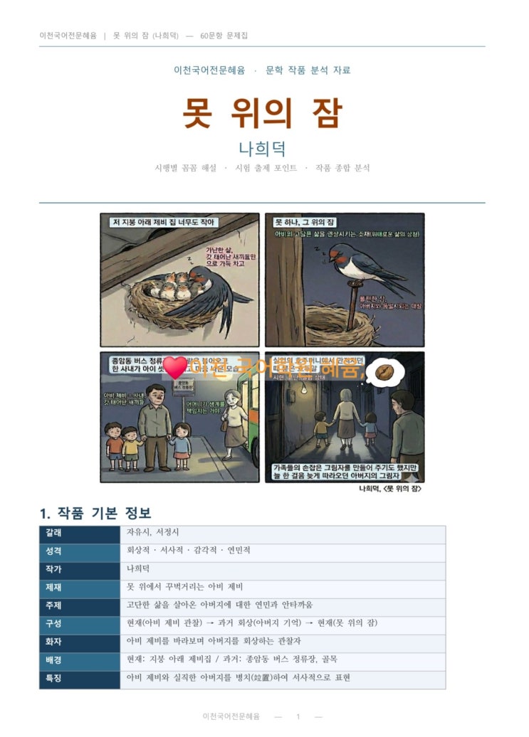 안녕하세요! 이천국어전문혜윰입니다 이천고 1학년 여러분, 중간고사 준비 잘 되고 있나요? 오늘은 시험 범위에 있는 나희덕 시인의 「못 위의 잠」을 쉽고 친근하게 소개해 드릴게요! 제목부터 좀 이상하죠? *못 위의 잠?* 못 위에서 잠을 잔다고? 처음엔 다들 이렇게 반응해요 그런데 읽다 보면 어느새 마음이 찡해지는 시예요. 아버지 이야기거든요. ✍️ 작가 나희덕은 어떤 분? 1966년생 시인으로, 가족·자연·생명을 주제로 한 따뜻하고 섬세한 시로 유명해요. 작은 자연의 장면 하나에서 사람의 삶을 발견하는 능력이 탁월한 분이에요. 「못 위의 잠」도 바로 그런 시랍니다. ## 시 줄거리, 이렇게 이해하세요 이 시는....... <img src="https://blogthumb.pstatic.net/MjAyNjA0MTNfMTY3/MDAxNzc2MDI1OTQ0NDkw.B6l6bNp8ctWYobywwmqwE9dpxnkDsiUvmm8WUEL1Ef0g.PV3cDPhmDx75L52KclPBcGmUGzkyxo0SNAGVwbCtD1gg.JPEG/1776025856360.jpg?type=s3" />