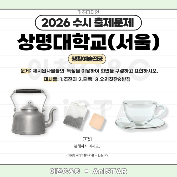 안녕하세요~! 이천 씨앤씨 미술학원입니다 오늘은 26년도 상명대학교 기초디자인 실기주제를 소개하려합니다~ 3절/5시간 재질감이 많이 느껴지는 사물들로 화면 구성을 요구했던 주제였습니다!! 평소에 다양한 재질들의 특성을 이해하고 연습하고 적용해보는 시간을 많이 가져보아요.*^^* 미대입시 이천씨앤씨와 함께해요~!! 모든 수험생들과 실기생들 화이팅~!! 저희 #이천씨앤씨미술학원 에서는 항상 최고의 실기력과 성실한 지도로 아이들이 좋은 결과를 보여줄 수 있도록 노력하고 있습니다 수상부터 명문 #미대합격 까지 항상 함께하며 결과를 보여드릴 수 있도록 하겠습니다 경기도 이천시 영창로 118 TEL. 031) 632 - 6403 - 월~금 02:30 ....... <img src="https://blogthumb.pstatic.net/MjAyNjA0MTRfMTAz/MDAxNzc2MTQ1NTI2MjMx.TgdvdNeCIyd44Eb1oG95FMolauEODa6IeaQcQhHhN2Qg.y-Y4Tma2mM7Ev0u787Cy52s3U7i6goagotP4ltZr4Ywg.PNG/3-%B8%F1%BF%F8%B4%EB.png?type=s3" />