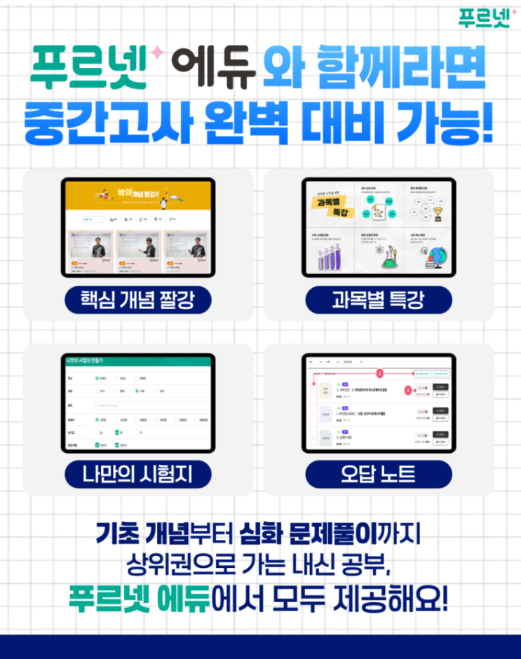 안녕하세요~~~~~ 박쌤푸르넷입니다. 새 학년 새 학기의 설렘도 잠시, 빠르게 다가온 1학기 중간고사 기간!!! 본격적으로 중학교 내신 대비를 해야 할 때가 왔는데요. 중학교에서는 시험 점수가 내신 성적에 직접 반영되기 때문에 체계적으로 공부 계획을 잡고 꾸준히 학습해야 해요! 오늘은 중학교 중간 고사 준비를 어떻게 해야 하는지 중간고사 대비 꿀팁을 알려드릴게요!!!!!! 1. 우선순위 정하기 본격적인 시험공부를 시작하기 전에 우선순위를 정하는 것이 매우 중요한데요!! 개인마다 어려워하는 개념, 과목 등이 매우 다르기 때문에 자신만의 우선 순위를 정해야해요. 다음의 기준을 참고해 우선순위를 정해보세요. ◆ 시험 일정 과목별 시....... <img src="https://blogthumb.pstatic.net/MjAyNjA0MTVfNDQg/MDAxNzc2MjIzMDcwODE5.TV1hKjXbvPeZZ7uUb7C-OSa4hJ75dO8I9oTajZajIo4g.v7Vlxn667IswhEZwZNeO57-DdLeS8IdJ44-xladMC8wg.PNG/image.png?type=s3" />