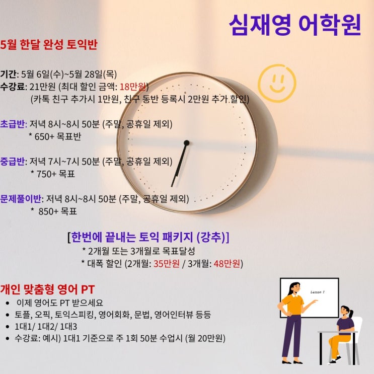 <5월 프로그램 한눈에 보기> 1. 5월 한달완성 토익 졍규반 (저녁) : 스테디 셀러 ㅎㅎ, 선생님들의 열강 직관^^ 2. 한번에 끝내는 토익 패키지 : 2달이나 3달로 목표점수 달성 계획이라면 패키지를 선택하는 센스로 비용 절약 (인기 폭발***) 4. 개인 맞춤형 영어PT : 나만의 맞춤 수업, 나만의 선생님, 토익이외에도 토플, 오픽, 토스, 회화 등 선택 꿀팁 1 : 정규반은 카톡 친구추가시 1만원 할인 혜택 있습니다. 꿀팁 2: 친구 동반 수강 신청시 2만원 할인 혜택 있습니다. 꿀팁 3: 패키지 프로그램 신청시 대폭 할인혜택 들어갑니다. 토익 이외의 과목은 1:1 또는 소그룹으로 영어 PT를 진행합니다. (토플, 오픽, 영어회화, 토익, 영어....... <img src="https://blogthumb.pstatic.net/MjAyNjA0MTRfMTky/MDAxNzc2MTM4NTI4NzEw.tUn9GkXHHzYtQ6feNoqgaDA26nBbLzlusvbnGkjWiy0g.0Ix9urbCXRMQp6VX_RyRQG_7HfE5OXShxYZ-gdOIsQkg.JPEG/5%BF%F9.jpg?type=s3" />