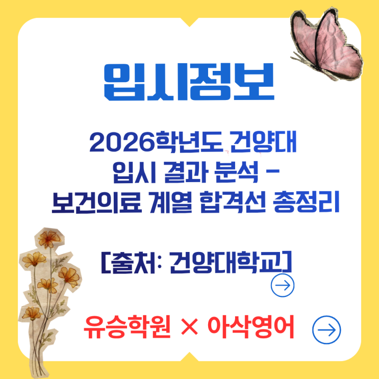 안녕하세요. 원주 단구동에서 20년, 실력으로 결과의 차이를 만드는 유승학원입니다. 최근 발표된 2026학년도 건양대학교 입시결과를 바탕으로, 우리 지역 학생들의 관심이 높은 보건계열과 주요 학과의 합격 가이드라인을 분석해 드립니다. 건양대는 글로컬대학30 선정 및 전국 최상위권의 취업률을 자랑하는 만큼, 전략적인 지원이 필요한 대학입니다. 1. 주요 학과별 합격자 성적 분석 가장 궁금해하실 학과별 내신 합격선(평균 및 최저) 데이터입니다. 의과대학(의학과): 명실상부한 건양대의 대표 학과로, 매우 높은 합격선을 유지하고 있습니다. 수능 최저학력기준 충족 여부가 합격의 당락을 결정짓는 핵심입니다. 간호대학/의료보건....... <img src="https://blogthumb.pstatic.net/MjAyNjA0MjFfMTM4/MDAxNzc2Nzc0MDM2MzU2.RJwYLVuEsY5rRwag0A6cjpTV2X4_eYERWVkAxMT5skog.9iCoYN4s95DnjrtGomJOfl-xYv9RaGqF0xmt5w4IY9Qg.PNG/%C6%C4%B6%F5%BB%F6%B0%FA_%B0%CB%C1%A4%BB%F6_%BD%C9%C7%C3%C7%D1_%BE%C6%C0%CC%C4%DC_%C0%FC%B9%AE%C0%FB%C0%CE_%B0%E6%C1%A6_%B1%DD%C0%B6_%BF%EB%BE%EE_%BB%E7%C0%FC_%C1%A4%BA%B8_%BE%C8%B3%BB_%C0%CE%BD%BA%C5%B8%B1%D7%B7%A5_%C4%AB%B5%E5%B4%BA%BD%BA_%286%29.png?type=s3" />