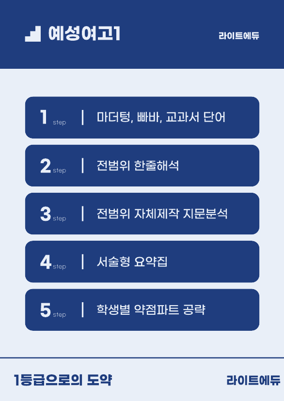 예성여고2 1등급 커트라인 80. 결과는 92점 압도적 1등급 예성여고 부교재 목차 마더텅 미니모의고사 빠르고 바른독해 기초세우기 워크북, 변형문제와 분석지로 고민하고 계시죠? 개념부터 적용까지 자체제작 교재로 빈틈없이 채웁니다. ✔ 고등부 수업 = 강의는 기본 ✔ 성적을 만드는 건 → 반복 가능한 자료 + 스스로 학습하는 시스템 단순히 듣고 끝나는 수업이 아니라, 학생이 혼자서도 풀고, 이해하고, 복습할 수 있도록 모든 교재 및 수업 연구에 온 힘을 다 합니다. “성실함이 성적을 만듭니다.” 라이트에듀는 관리 + 자료 + 반복 학습으로 1등급 결과를 만들어냅니다. <img src="https://blogthumb.pstatic.net/MjAyNjA0MjNfMTcy/MDAxNzc2OTE5NjI4NTc0.1a6JJ5-C1TnPqdQV3BYcqQYi8hqQXVjap-lrXnwD9qYg.yS0feMeyIEYbE5wdUL-ncdNezgHsJlHRwfgOl-_KSV4g.PNG/image.png?type=s3" />