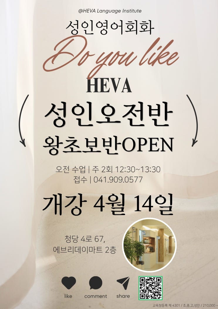 왕!초보반 오전반 OPEN 청당동 HEVA어학원 수업 : 주 2회, 12:30~13:30 접수 : 041.909.0577 주소 : 청당 4로 67, 에브리데이마트 2층 HEVA어학원 청당점 #확장오픈 더 넓어진 공간에서 영어 시작해보세요 <img src="https://blogthumb.pstatic.net/MjAyNjA0MDZfNDIg/MDAxNzc1NDQ4NjY0MzY5.AV4nCdnRipM4lQoms_nLOM4TaYpPDkmRLlVgAO1EyOIg.atipHu6_JzE_EDxnagL7yZKfaL4cTo436e1HV6q1HpEg.JPEG/26.04_%BC%BA%C0%CE%BA%CE_%BF%C0%C0%FC%BF%B5%BE%EE.jpg?type=s3" />