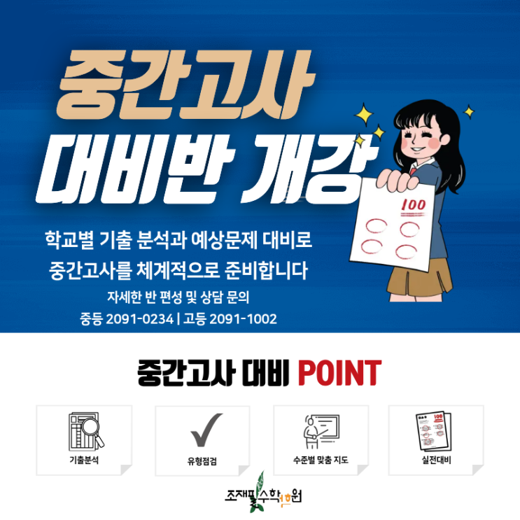 조재필수학학원 중간고사 대비반 개강! 내신 대비 상담 안내