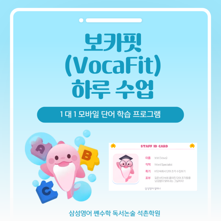 안녕하세요. 석촌동 영어학원 삼성영어 쎈수학 독서논술 석촌학원입니다. 오늘은 삼성영어셀레나의 영어 단어 학습 프로그램 VocaFit(보카핏)의 하루 수업 과정을 자세하게 알려드리려고 해요! VocaFit(보카핏)은 무엇인가요? VocaFit (보카핏)은 삼성영어셀레나의 1:1 단어 학습 프로그램이에요. 초중고 필수 어휘 4,936개가 수록된 삼성영어셀레나 단어장 7권을 그대로 담아 교재와 100% 연동된 학습을 할 수 있어요. 학원에서는 단어장 교재로 단어를 학습하고 집에서는 VocaFit 프로그램으로 한번 더 복습할 수 있습니다. 특히 VocaFit은 모바일에 최적화되어 있어 언제 어디서나 간편하게 복습할 수 있답니다. VocaFit 하루 수업, 이렇게 진....... <img src="https://blogthumb.pstatic.net/MjAyNjA0MTVfMTU1/MDAxNzc2MjQzMzg5NTYy.YsfVsUFVZ37YY_dba6R-tRiloKIZcYQQjkBEfnSzZEAg.VN6DttK4SNSdTqPy0-WellSqBOdwjmOEzCk1khJNFDwg.PNG/%C1%A6%B8%F1%C0%BB_%C0%D4%B7%C2%C7%D8%C1%D6%BC%BC%BF%E4._%289%29.png?type=s3" />