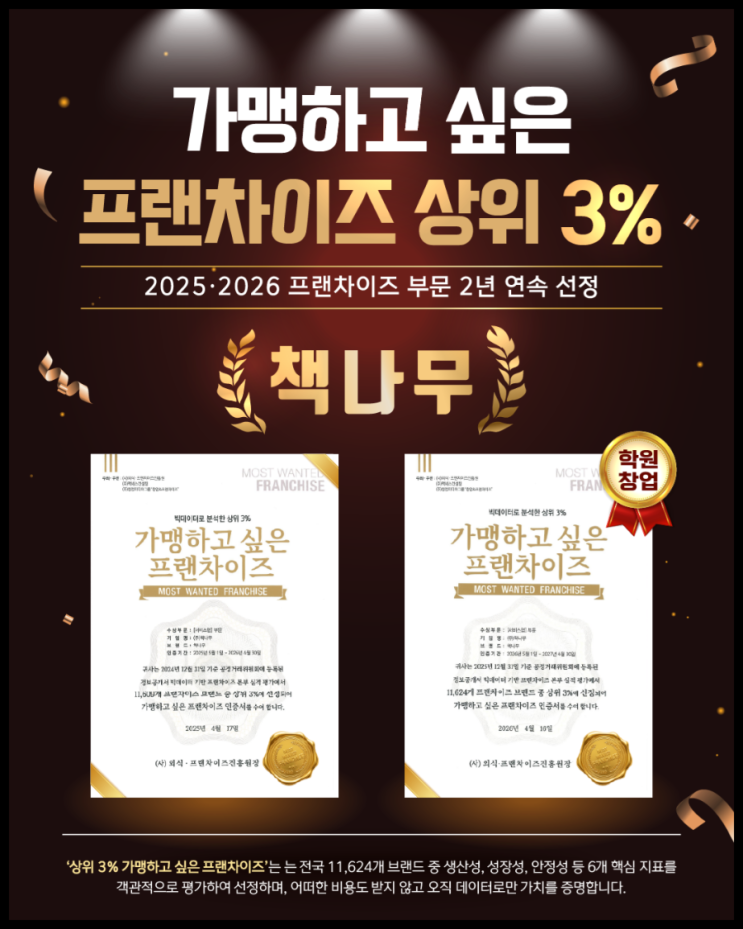 책나무, 2년 연속 ‘가맹하고 싶은 프랜차이즈 상위 3%’ 선정! 학부모님이 선택하는 이유는 다릅니다 최근 반가운 소식이 있어 학부모님들께 전해드립니다 책나무가 ‘2026 빅데이터 기반 가맹하고 싶은 프랜차이즈 상위 3%’에 선정되었습니다. 무엇보다 의미 있는 점은 2025년에 이어 2026년까지 2년 연속 선정이라는 점입니다. 왜 중요한 선정일까요? 이번 평가는 단순한 인기나 이미지가 아닌 객관적인 데이터 기반 분석으로 이루어졌습니다. ✔ 공정거래위원회 정보공개서 기준 ✔ 전국 11,624개 프랜차이즈 대상 ✔ 비용 없이 순수 데이터 평가 그리고 아래 6가지 핵심 지표를 통해 선정됩니다. 생산성 성장성 안정성 노하....... <img src="https://blogthumb.pstatic.net/MjAyNjA0MjBfMTQw/MDAxNzc2NjUzNTUyMDM4.Yktfg8nGPYVwBKBSJEj5cSSB_1fXSnsV-yekLp2q_HEg.3MHcqDPfIqiYcmRkaqbm6Xrf2HwSXJDCx0TwH44la3Ag.PNG/900_20260419_144631_0000.png?type=s3" />