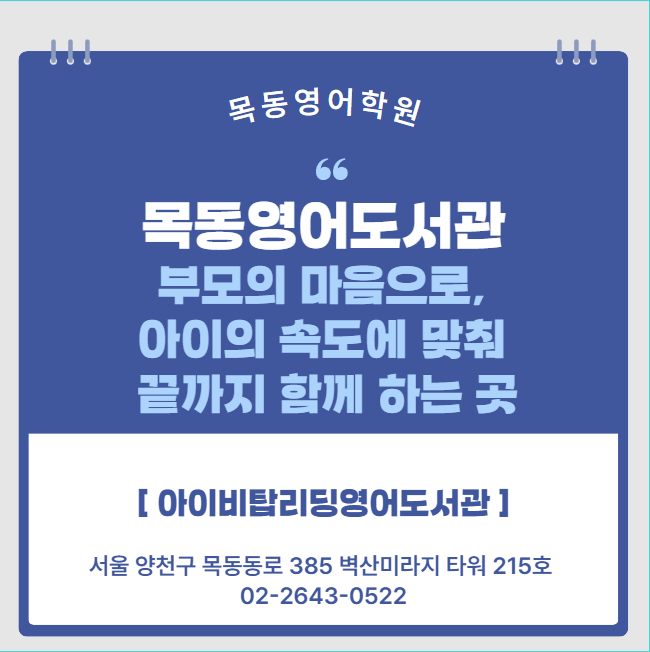 안녕하세요. 목동영어학원 아이비탑리딩영어도서관입니다. 아이의 영어 공부를 지켜보며 한 번쯤은 이런 고민을 하게 됩니다. “분명 열심히 하고 있는데, 왜 실력은 눈에 띄게 늘지 않을까?” 많은 경우 그 이유는 단순합니다. 문제를 푸는 공부는 하고 있지만, 읽고 이해하는 힘은 제대로 쌓이지 않았기 때문입니다. 목동영어학원인 저희 아이비탑리딩영어도서관은 이 지점에서 출발합니다. 저희 시작은 단순한 교육 철학이 아니라, 제 실제 경험에서 비롯되었습니다. 15년 전, 아이와 함께 미국으로 유학을 떠났습니다. 한국에서는 영어를 꾸준히 공부해왔고 어느 정도 실력이 있다고 생각했지만, 첫 성적표를 받아든 순간 놀라운 이야기를 듣....... <img src="https://blogthumb.pstatic.net/MjAyNjA0MTBfOTUg/MDAxNzc1ODA0NDg0NTI4.YohpctjEhxrUHvs2MTMq7l2zqr-gDmbV8fduLEWK7o4g.yiWNqEVGUSxgjrDt2RUbeGDotJ_BWNBVo99jZAzVsy0g.PNG/image.png?type=s3" />