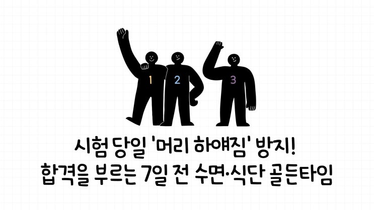 안녕하세요! 하이엔드학원입니다. 열심히 공부했는데 시험지 앞에만 서면 갑자기 머릿속이 하얘지는 '블랙아웃' 현상, 겪어본 적 있나요? 이는 실력이 부족해서가 아니라 뇌의 컨디션 조절 실패 때문입니다. 시험 당일, 여러분의 실력을 120% 발휘하게 해줄 D-7 수면 & 식단 루틴을 공개합니다! 1. 수면 루틴: "뇌의 시계를 시험 시간에 맞춰라" 우리 뇌가 잠에서 깨어나 최고 효율을 내기까지는 최소 2~3시간이 걸립니다. - 기상 시간 고정: 시험 시작 3시간 전(보통 오전 6시~6시 30분)에 일어나는 연습을 오늘부터 시작하세요. - 7시간의 마법: 뇌세포 사이의 노폐물을 씻어내고 기억을 정리하는 데는 7시간 이상의 숙....... <img src="https://blogthumb.pstatic.net/MjAyNjA0MTdfNTgg/MDAxNzc2NDE4NTkxMjMx.tHfmmxnK8Kyz9uJUSYP0JPRfbZpI-zWFXUWMsDAqVqkg.e6X3uMZIEUMvyXMzVjNZuAMCJea2UEJXtC4i3Nv5Mg4g.JPEG/1.jpg?type=s3" />