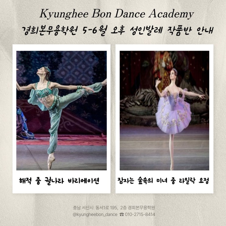 안녕하세요, 경희본무용학원입니다:) 5-6월 오전 성인 발레 작품 안내드립니다 오전반의 경우 화요일 토클래스 목요일 작품반으로 진행예정입니다 경희본무용학원에서 윤정쌤의 첫 작품반 수업을 진행해보려고 하는데요, 작품반 티칭 경험도 많아 더욱 기대가 되네요 ♥️ 차주 4/20(월)부터 신청 받으며, 천천히 고민해보시고 도전해보세요 ♥️ 정원은 6명, 3인 미만 시 폐강됩니다:) 작품반은 결석시 순서 숙지가 어렵기 때문에, 이월&보강 없이 진행되므로 이 점 참고하여 주시고 신중하게 결정해주시면 감사하겠습니다 ♥️ 시작일은 5월 둘째주부터 진행예정이며, 6월 첫째주 또한 선거와 연휴가 겹쳐서 많이 결석하실 것....... <img src="https://blogthumb.pstatic.net/MjAyNjA0MjBfNzkg/MDAxNzc2NjcyNzEwODYz.R5MnknmmKttv4iMfKIDSc6Hs2wxXRJhMcSLayBVhPEYg.hrQfpKeyfQAu3TLt936mG8pTmjyRuxTmw4F4WIBtgXcg.JPEG/%C1%A6%B8%F1%C0%BB_%C0%D4%B7%C2%C7%D8%C1%D6%BC%BC%BF%E4._%283%29.jpg?type=s3" />