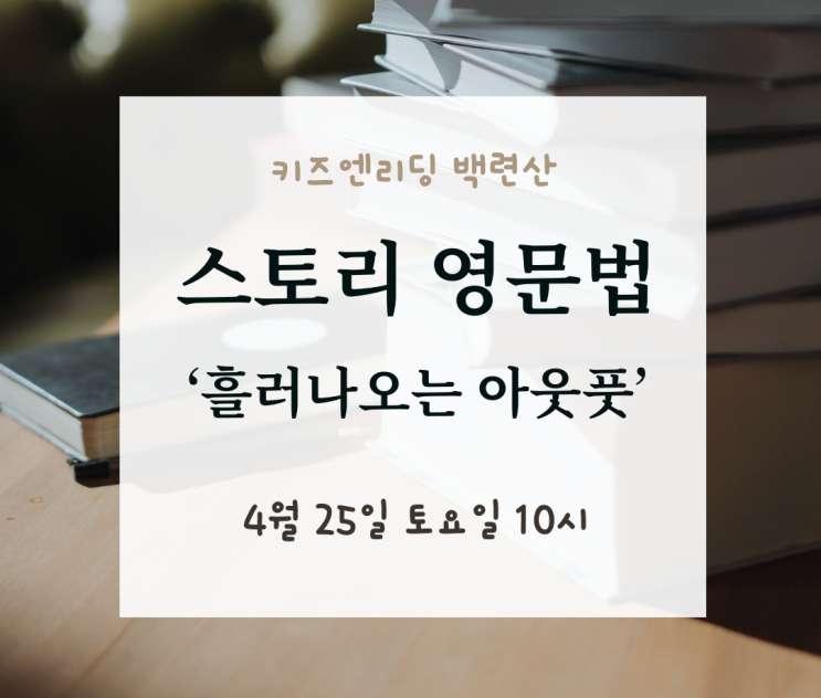 안녕하세요! 즐겁게 영어 책을 읽고 생각머리를 키우는 키즈엔리딩 백련산입니다. 2022년 교육 개정안이 시행되고 있습니다. 영어 교육은 무엇이 달라질까요? 무엇이 어떻게 달라진다고 해도 본질은 변함이 없습니다. 원서 독서로 문해력의 뿌리가 탄탄해 졌다면 기둥을 세워 아웃풋의 싹을 틔울 수 있습니다. 그래서 '스토리 영문법' 수업이 필요합니다. 5월 스토리 영문법 신규반 오픈을 앞두고 있습니다. 이 시기에 맞추어 흘러나오는 아웃풋을 완성시키는 키즈엔리딩의 학생 주도형 영문법 수업을 소개합니다. 주제 ✔ 2022년 교육 개정안 시행에 따른 영어 수업 변화와 방향 ✔ 스토리 영문법 수업 ✔ 글쓰기 아웃풋 ?....... <img src="https://blogthumb.pstatic.net/MjAyNjA0MTJfODMg/MDAxNzc1OTYwMzcwMzM3.77b_afpD9Rc_W1SUP68IqA9YKHoWvln-rTarEsWn7AAg.4Qy_MQCAllwo_H4clugBPpL2dgZdudkiGLpijgqHOtog.PNG/%BC%B3%B8%ED%C8%B8.png?type=s3" />