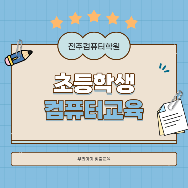 안녕하세요 전주삼천동에 위치한 전주컴퓨터학원입니다. 2026년 새학기가 시작되고 벌써 4월 중반을 향해 가고 있네요 우리아이 새로운 환경에서 적응을 잘하는지 학업은 무리없이 잘 진행하는지 걱정하시는 학부모님 계시죠 요즘 초등학생도 과제물 제출이 있어 컴퓨터를 다뤄야 할 경우가 많은데 매번 도와주기도 쉽지 않습니다. 저희 전주컴퓨터학원에서는 초등학생 아이들을 위한 자격증 수업을 진행하고 있습니다!! 컴퓨터를 처음 접하는 친구들에게는 기본기인 타자연습부터 한글 ,ppt, 엑셀 , 포토샵 등 문서를 작성과 이미지 생성 능력을 키울 수 있습니다. AI로 다 만들 수 있는거 아닌가요? AI 시대가 열렸지만 기초적인 컴퓨터 지식 없....... <img src="https://blogthumb.pstatic.net/MjAyNjA0MTVfNTEg/MDAxNzc2MjQxMjcwNTU2.ifs3G0Xv3ev5WTGlNMyXVB-4eSMzojC8yEgZ9zTEEBMg.21mbKOV0IfMwI98L9cvg3lw44OwvvdNVvYXqfoO-a8gg.PNG/%C1%A6%B8%F1%C0%BB_%C0%D4%B7%C2%C7%D8%C1%D6%BC%BC%BF%E4._%281%29.png?type=s3" />