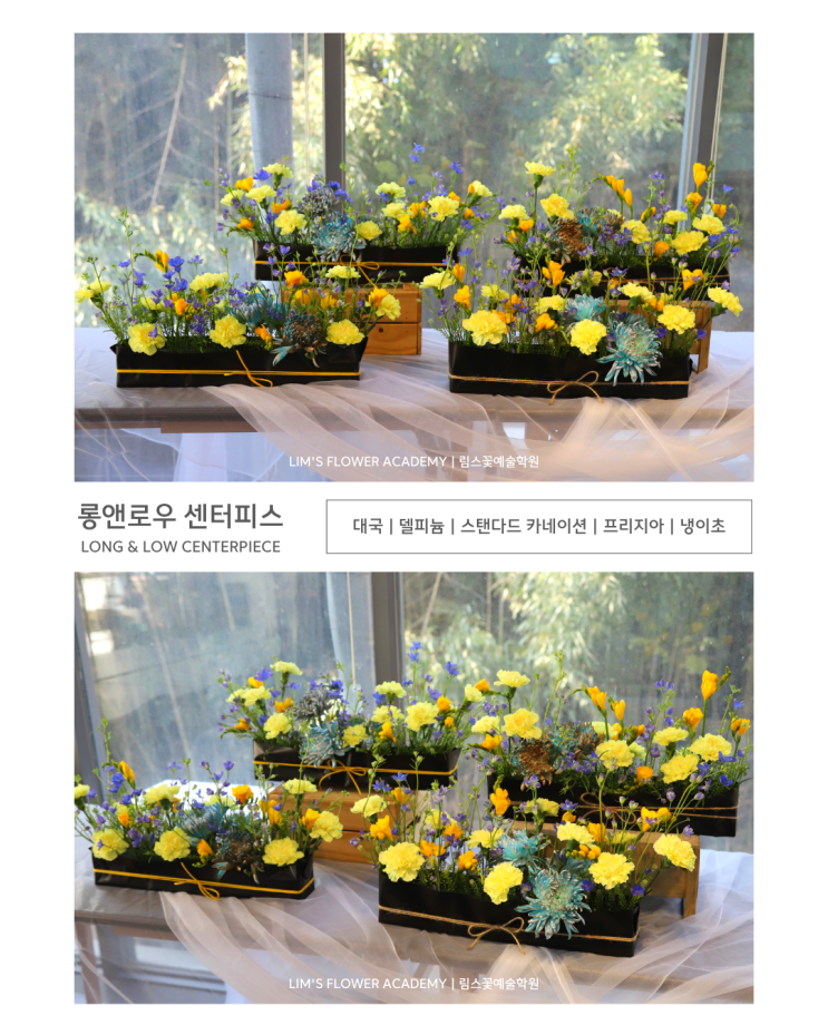 ✨ 낮게 흐르는 꽃의 선율, 가장 내추럴한 라인감 가로의 선형미와 볼륨감의 조화가 아름다운 롱앤로우 센터피스 (LONG & LOW CENTERPIECE) #롱앤로우센터피스 가로로 길고 높이가 낮은 형태의 꽃꽂이 스타일입니다. 주로 긴 식탁이나 회의용 테이블, 웨딩 테이블 등에 사용되며, 마주 앉은 사람의 시야를 가리지 않으면서 공간을 풍성하게 채워주는 것이 특징입니다. |수평적 라인 좌우로 길게 뻗는 라인을 강조하여 안정감과 우아함을 줍니다. |다양한 활용 홈파티, 결혼식 연회석, 호텔 로비, 기업 행사 등 격식 있는 자리에 자주 쓰입니다. |시야 확보 높이가 낮게 설계되어 테이블에 앉은 사람들이 서로 얼굴을 마주 보며 대화....... <img src="https://blogthumb.pstatic.net/MjAyNjA0MjBfNDMg/MDAxNzc2NjcxMTA2MDUw.nmWHzB4nRPJioBOXj2RgCqzhb_Ioa8DmUfgoEBiR3Ecg.d6sURJHOcDEMkA0r3rOzy2l9J30ixIZqn0RNhfjt4Rwg.PNG/1.png?type=s3" />