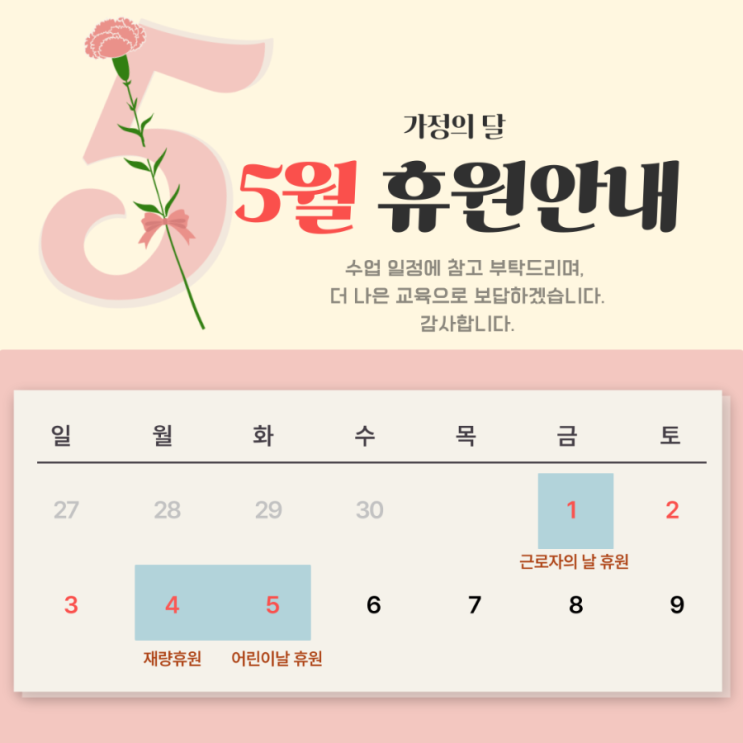- 5/1~5/5 휴원 할 예정입니다. - 5/24~25 석가탄신일 연휴 초등부 휴원, 중고등부 정상 수업 할 예정입니다. 아이들 일정 확인 후 변동 사항 있으면 다시 안내 드리겠습니다^^ <img src="https://blogthumb.pstatic.net/MjAyNjA0MDdfOTIg/MDAxNzc1NTY0MTA0NzQz.Ohy7t_3MAV5dzSgW6t6u6rDwB-mL50mcVJjOWbY2Up4g.f5_TiQsxOpbrMOHHLcBfxlTKpmSCTxKBBH_5yWxtmAkg.PNG/900%A3%DF1775563997996.png?type=s3" />