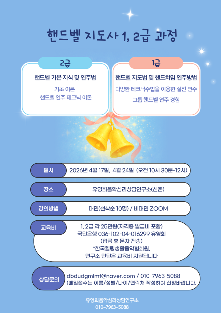 2026년 1학기 4월 연구소 세계민속악기시리즈 음악치료기술 핸드벨 교육일정 공지드립니다.~^^ 핸드벨은 음악치료 임상현장 뿐만 아니라 문화예술교육/치유 현장에서도 매우 효과적인 교육 악기입니다. 교육에 관심있으신 분들은 연구소로 문의주세요~ 감사합니다. 유영희음악심리상담연구소 dbdudgmlmt@naver.com #핸드벨자격증 #음악치료기술 #핸드벨1인1악기 #음악치료인턴교육 #유영희음악심리상담연구소 #핸드벨합주 <img src="https://blogthumb.pstatic.net/MjAyNjA0MTJfNjkg/MDAxNzc1OTcxOTM4Mzg1.Lv7ZuNr2uQdwCn37PVvonc8DZKn6Z5847rTzcnYCbRgg.rBqavA1stEefAFWdT6Pxdsyox9dYOa_h3mcSE46ldVMg.PNG/1775970199747.png?type=s3" />