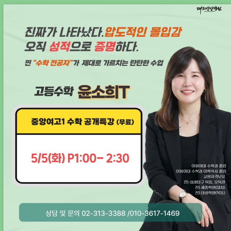 [윤소희T] 중앙여고1수학 공개특강 진짜가 나타났다. 학생이 먼저 반응하는 몰입감 있는 수업, 오직 결과와 실력으로 증명하겠습니다. 안녕하세요, 대치상상학원입니다. 중앙여고1 수학의 명쾌한 해답, 윤소희 선생님의 공개특강 소식을 전해드립니다. 수학 전공자가 전하는 1등급으로 가는 가장 확실한 길을 제시합니다. ✨ 윤소희 선생님을 소개합니다 "수학 전공자가 전하는 진짜 수학의 힘" 전문성: 이화여대 수학과 학사/석사 졸업, 교원 자격증 보유 경력: 목동 미래탐구, 대치 세종/대성학원 등 주요 학원가 강의 역임 철학: 원리를 꿰뚫는 명쾌한 강의와 끝까지 책임지는 밀착 관리 윤소희T의 '압도적' 수업 특....... <img src="https://blogthumb.pstatic.net/MjAyNjA0MTlfMTYw/MDAxNzc2NTk3NzYzMzg4.mjUV4ItmlOkjf_so9UgyUFwzilcWSStLU_KiAfijOUMg.z0TqCCxEo6immkwdE71zC1ItXexCFnei1AKqgmiHyIsg.JPEG/%C0%B1%BC%D2%C8%F1T.jpg?type=s3" />