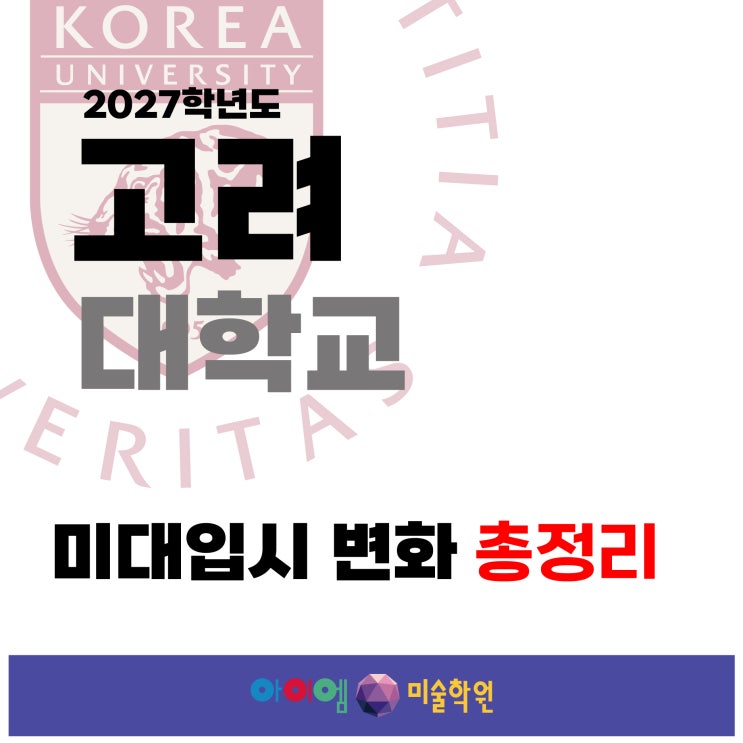 안녕하세요 :) 강남 아이엠미술학원입니다. 입시 변화 정리 여섯 번째 포스팅입니다. 이번에는 2027학년도 고려대학교 미술·디자인계열 입시를 정리해보았습니다. 고려대학교는 매년 많은 학생들이 지원하는 학교 중 하나인데요, 2027학년도는 별도의 주요 변경사항 없이 기존 전형 구조가 유지되는 흐름을 보입니다. 실기 완성도에 따른 변별력이 중요한 만큼 기본기를 바탕으로 한 안정적인 준비가 필요한 대학입니다. 2027 입시를 준비하는 학생들이라면 꼭 한 번 체크해보시길 바랍니다! :) 고려대학교는 실기 전형 중심으로 선발이 이루어지며 매년 많은 학생들이 지원하는 학교 중 하나인데요, 많은 학생들이 궁금해하는 입시 구조를 중심....... <img src="https://blogthumb.pstatic.net/MjAyNjA0MTZfMTAg/MDAxNzc2MzI3OTM1MjA0.mIvTTfFgVcICtJxJcygarjGtgdQ1fvAm4jzGCGbomHYg.Lw0WKNMHtMW-HabhnSLfu3cNeDDrZUO61eP4JPswR8kg.JPEG/%BA%ED%B7%CE%B1%D7%BF%EB_%B0%ED%B4%EB%C3%B3%C0%BD_%BB%E7%C1%F8_%B4%EB%C1%F6_1.jpg?type=s3" />